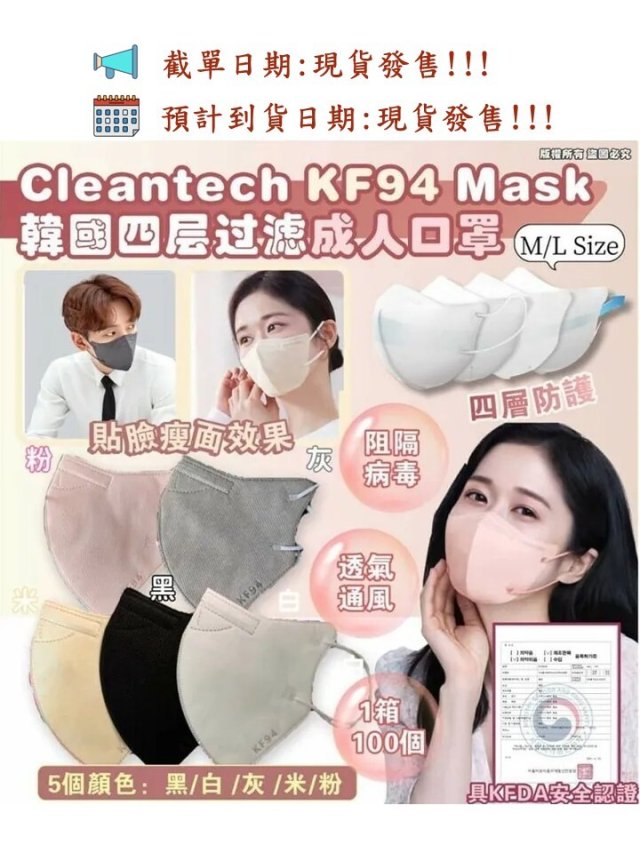 韓國Cleantech KF94 Mask 四層成人口罩(一箱100片同色)