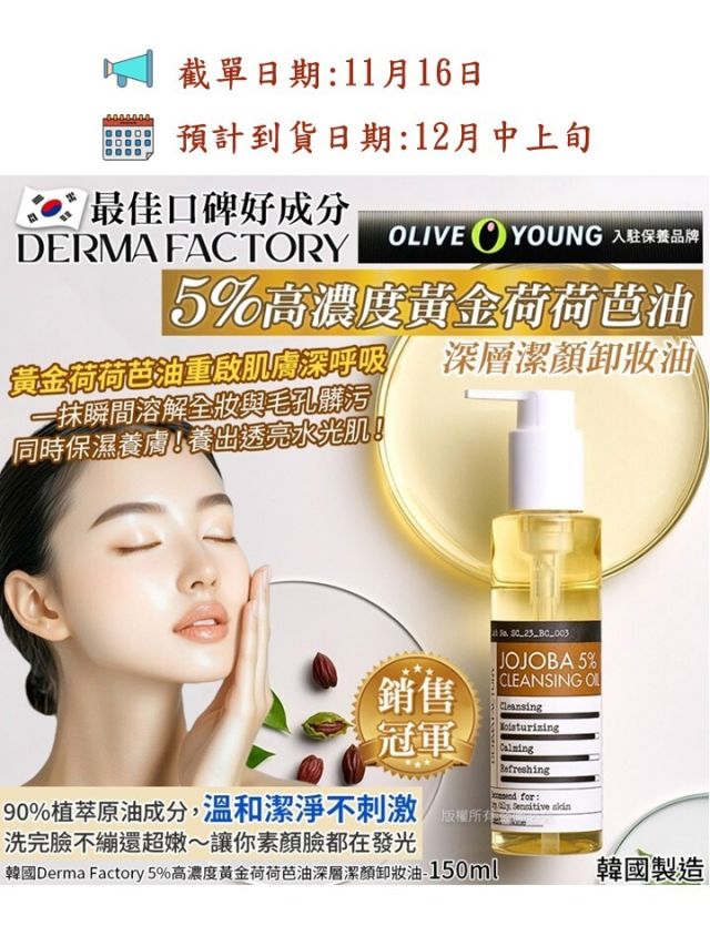 韓國Derma Factory 5%高濃度黃金荷荷芭油深層潔顏卸妝油-150ml