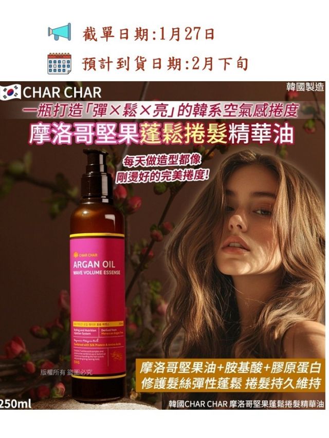 韓國CHAR CHAR 摩洛哥堅果蓬鬆捲髮精華油-250ml