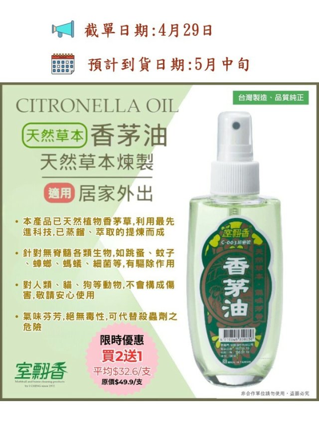 台灣室翲香香茅油 100ml (買2送1)