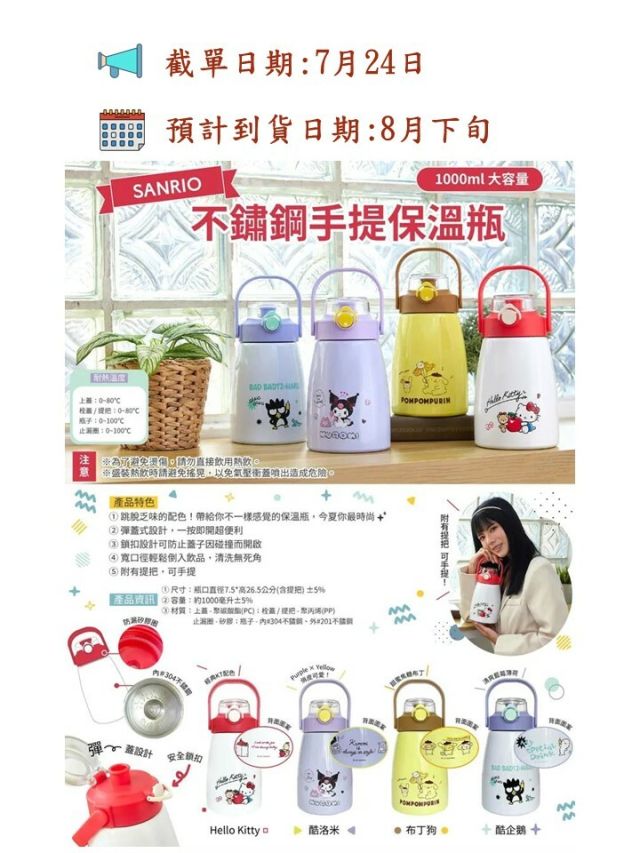 Sanrio 不鏽鋼手提保溫瓶水壺1000ml