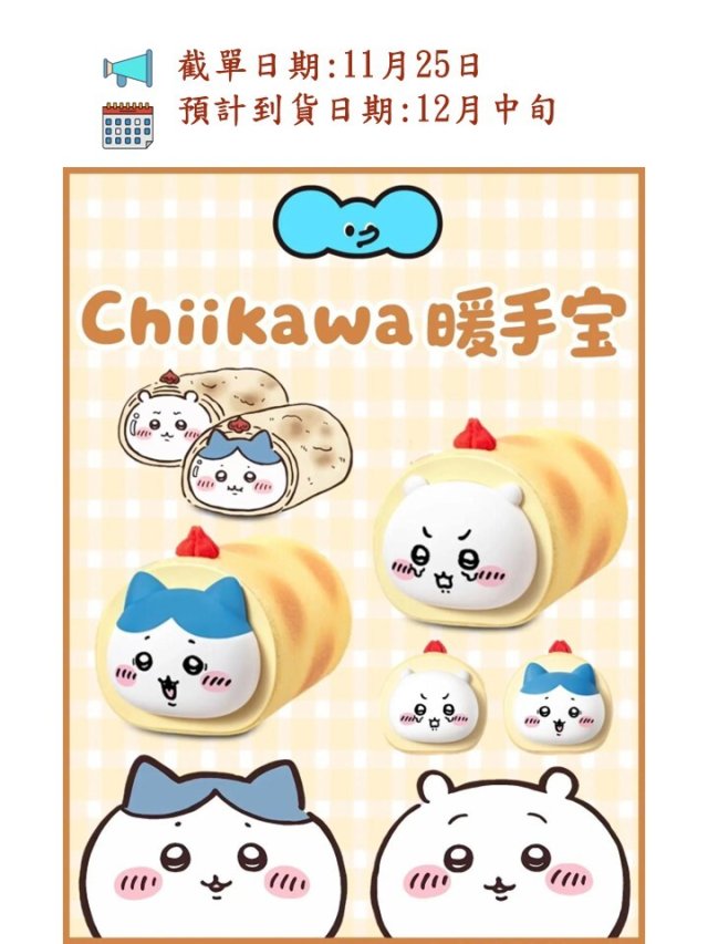 MarTUBE x Chiikawa蛋糕卷造型暖手寶