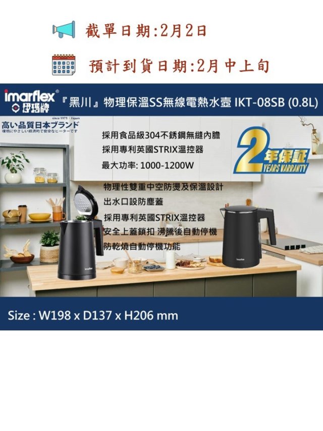 伊瑪牌"『黑川』物理保溫SS無線電熱水壼 IKT-08SB (0.8L)