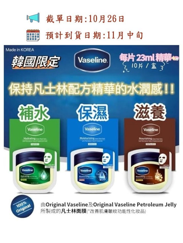 韓國製 Vaseline 凡士林 高效保濕 面膜系列 10片/盒