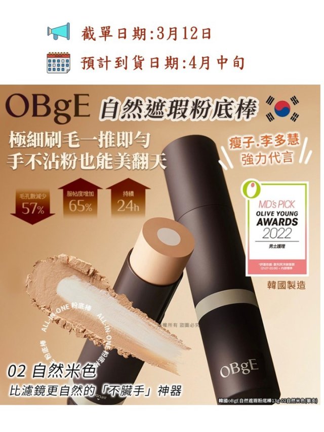 韓國 OBgE 自然遮瑕粉底棒13g(02自然米色)