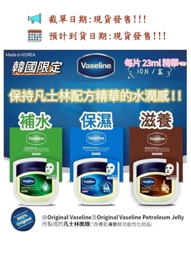 韓國製 Vaseline 凡士林 高效保濕 面膜系列 10片/盒