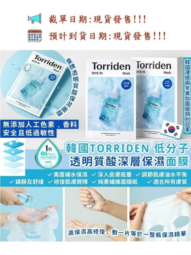 韓國🇰🇷Torriden低分子透明質酸深層保濕面膜(一盒10片)
