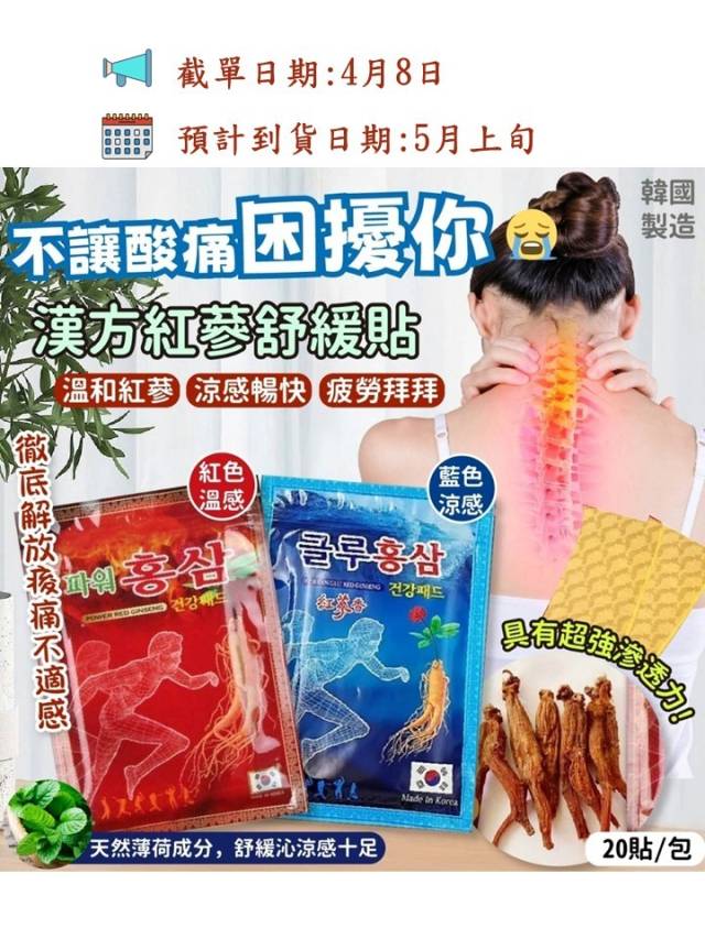 韓國漢方紅蔘溫感舒緩貼布20片 (1套4包)