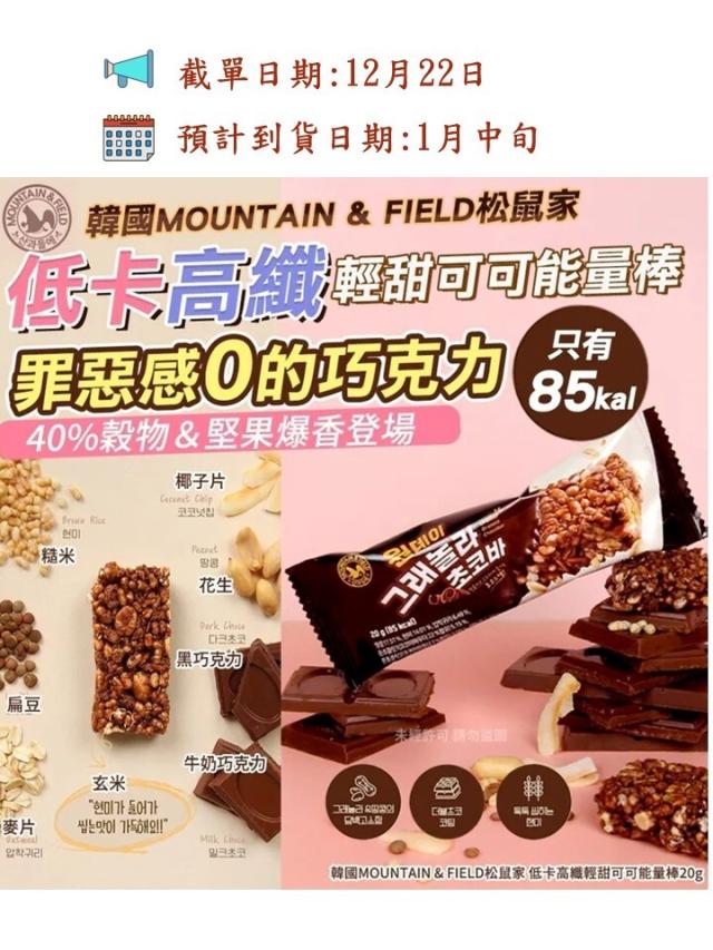 韓國 MOUNTAIN & FIELD 松鼠家低卡高纖輕甜可可能量棒 20g (1套5包)