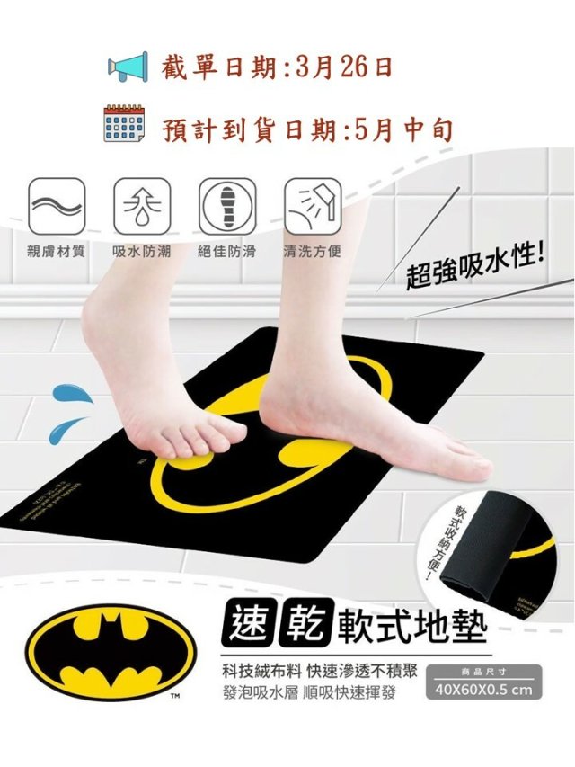 台灣 蝙蝠俠3秒瞬吸速乾軟式地墊