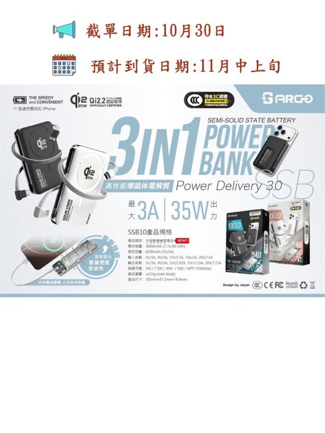Argo新款 SSB10 Qi2.2 35w Power bank