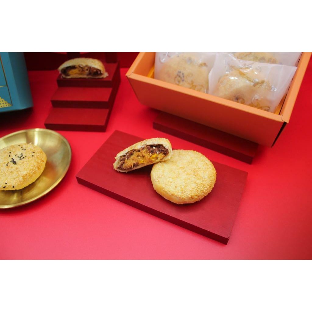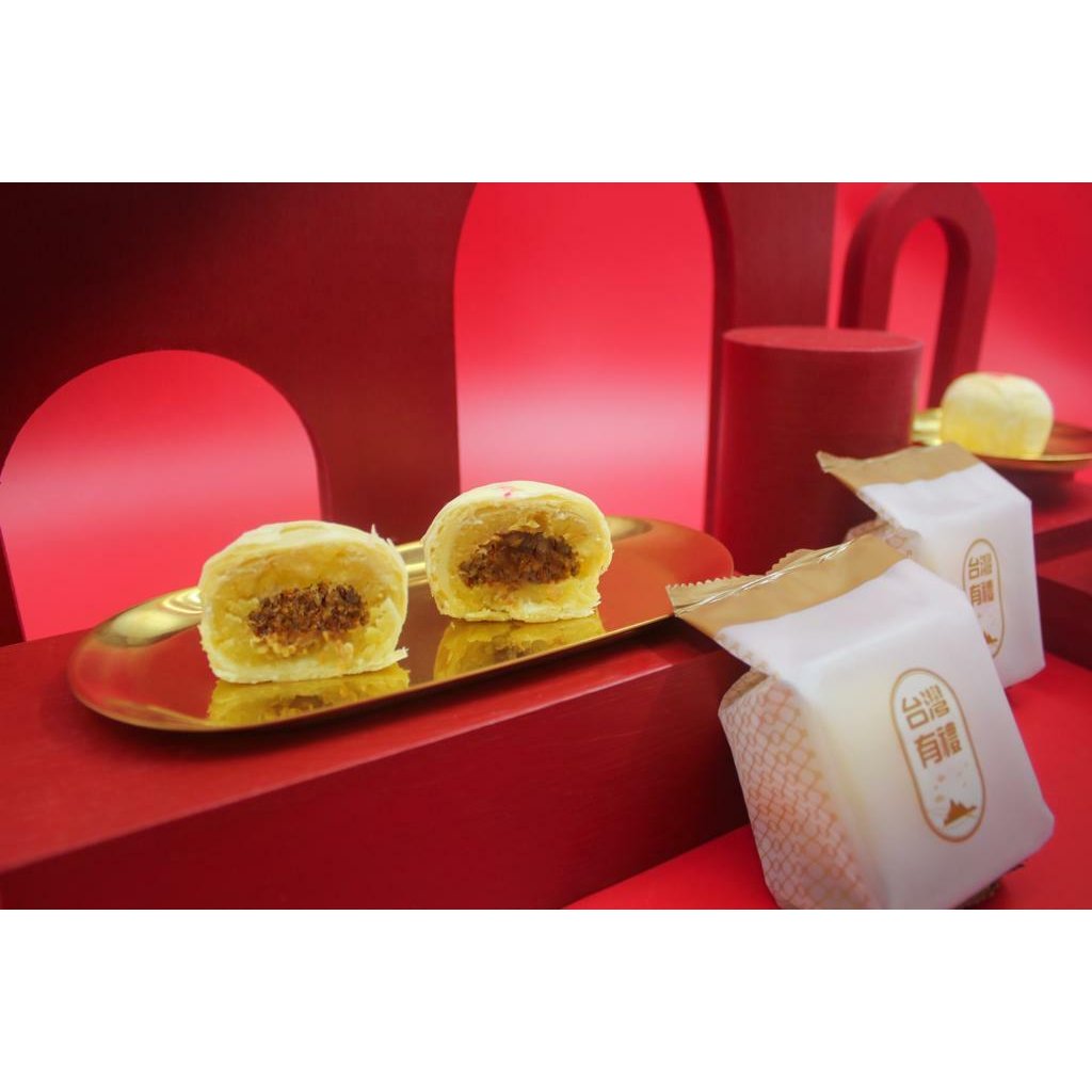 濃郁鹹香的黑豬肉脯和軟Q的麻糬搭配著研磨細緻蛋黃,拌和紅豆和芋頭製成的內餡,以細膩的工法揉合道地的風味 ,鬆軟綿蜜 甜而不膩的絕妙口感
