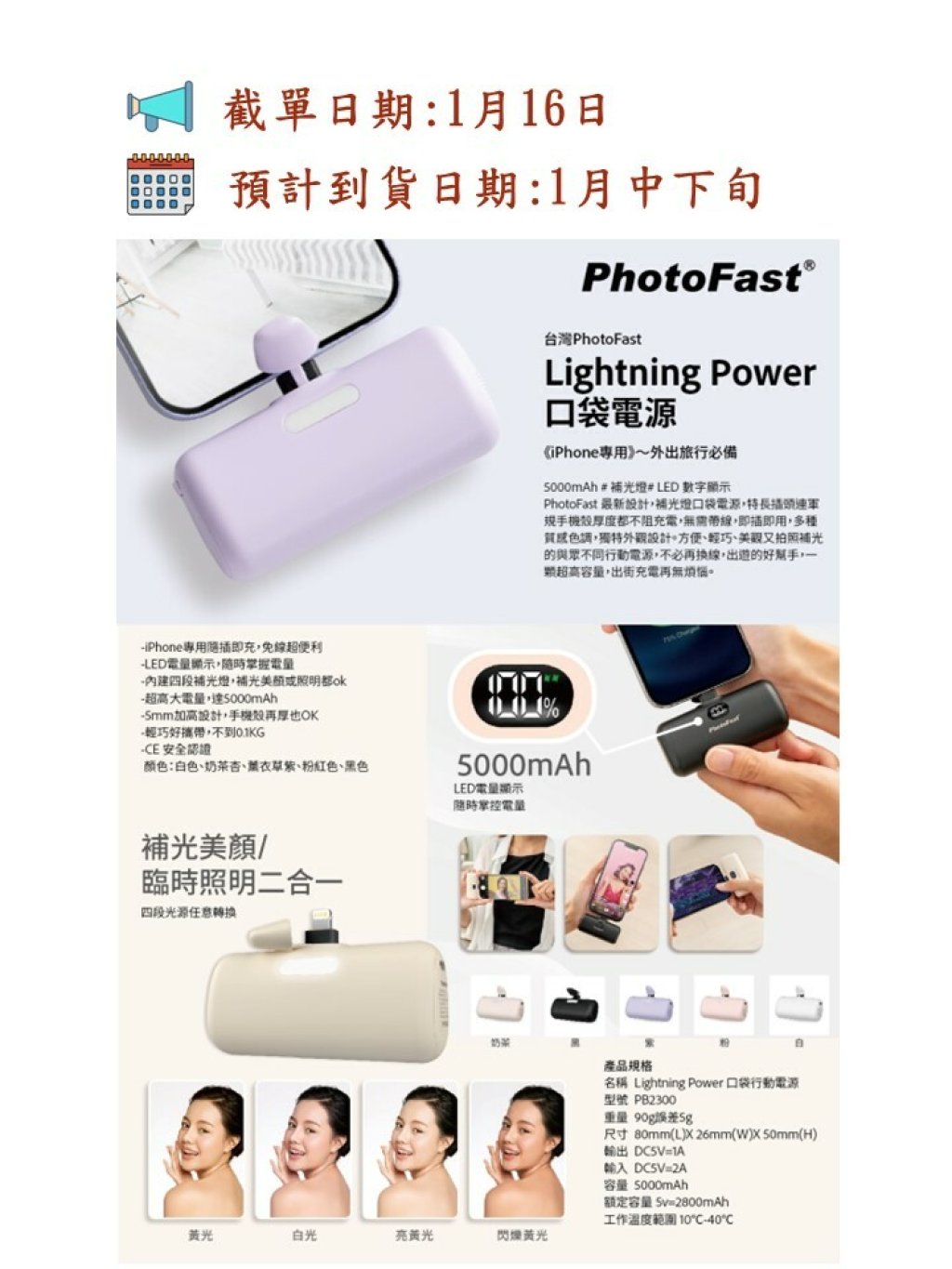 PhotoFast 最新設計,補光燈口袋電源,特長插頭連軍規手機殼厚度都不阻充電,無需帶線,即插即用,多種質感色調,獨特外觀設計。方便、輕巧、美觀又拍照補光的與眾不同行動電源,不必再換線,出遊的好幫手,一顆超高容量,出街充電再無煩惱。
