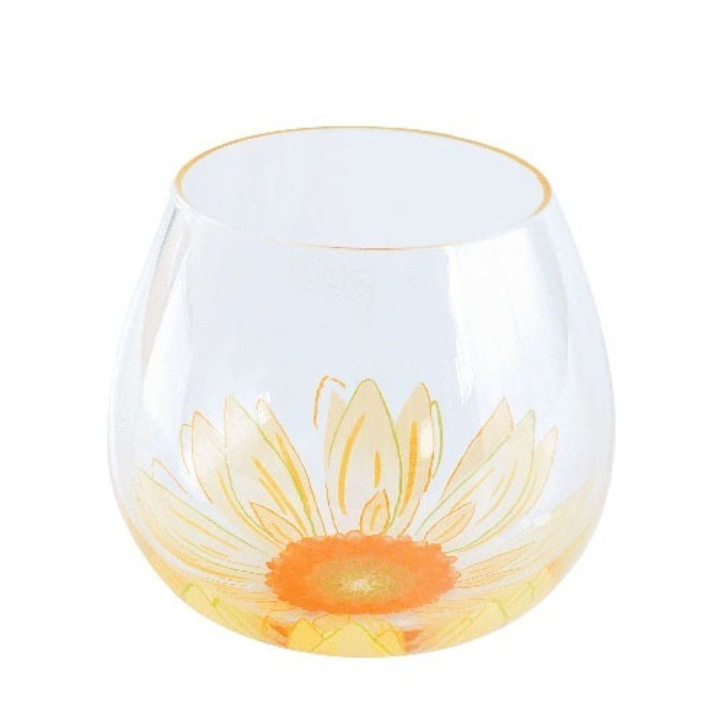 圓圓杯底,玻璃底部印上輪廓簡潔的非洲菊和向日葵花型🌸,顏色柔和。