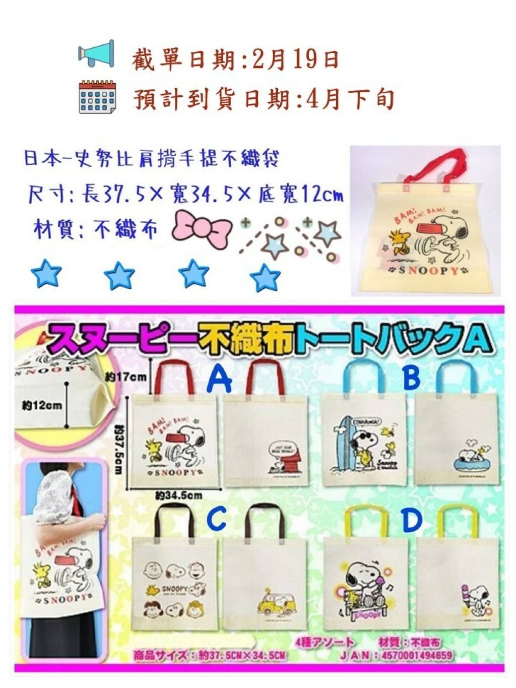 🟡台灣 史努比肩背手提不織布提袋🟡