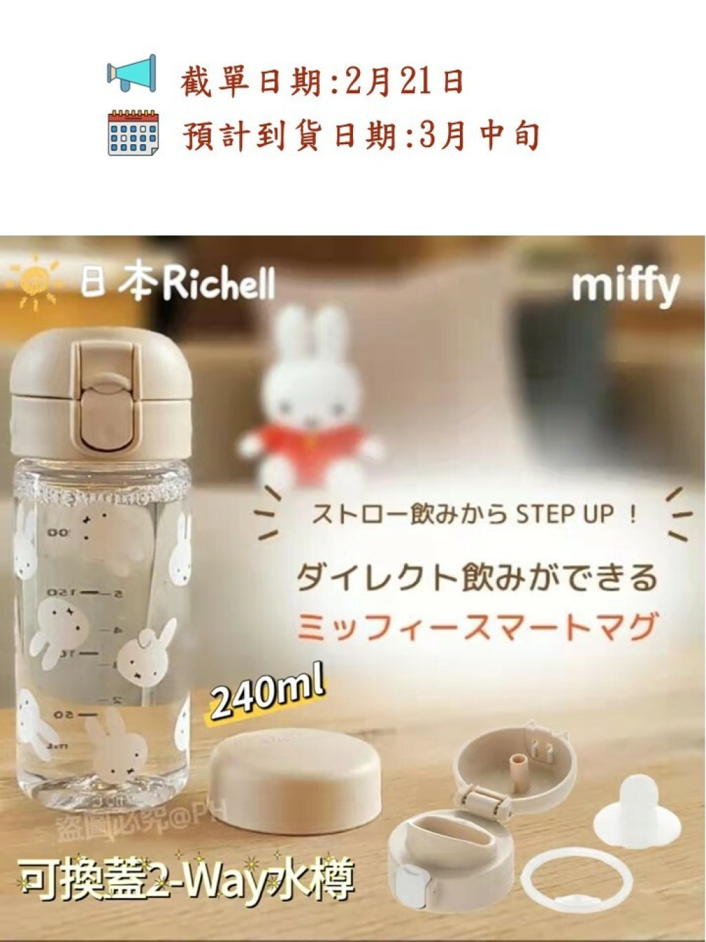 🎌日本Richell 可換蓋2-Way水樽 240ml - Miffy🎌