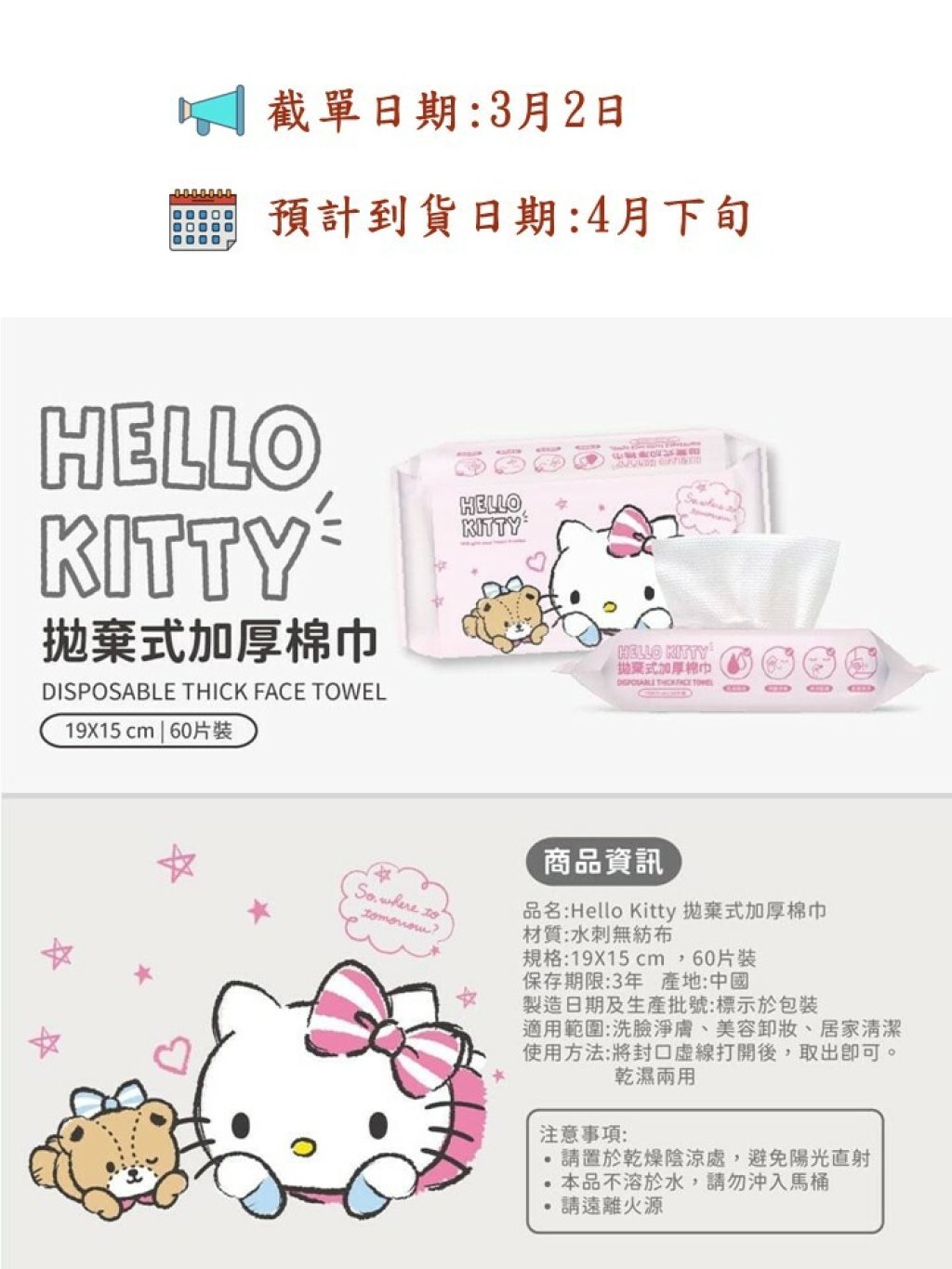 🟡台灣 Sanrio Hello Kitty 拋棄式加厚棉巾1組3包 (60抽/包)🟡