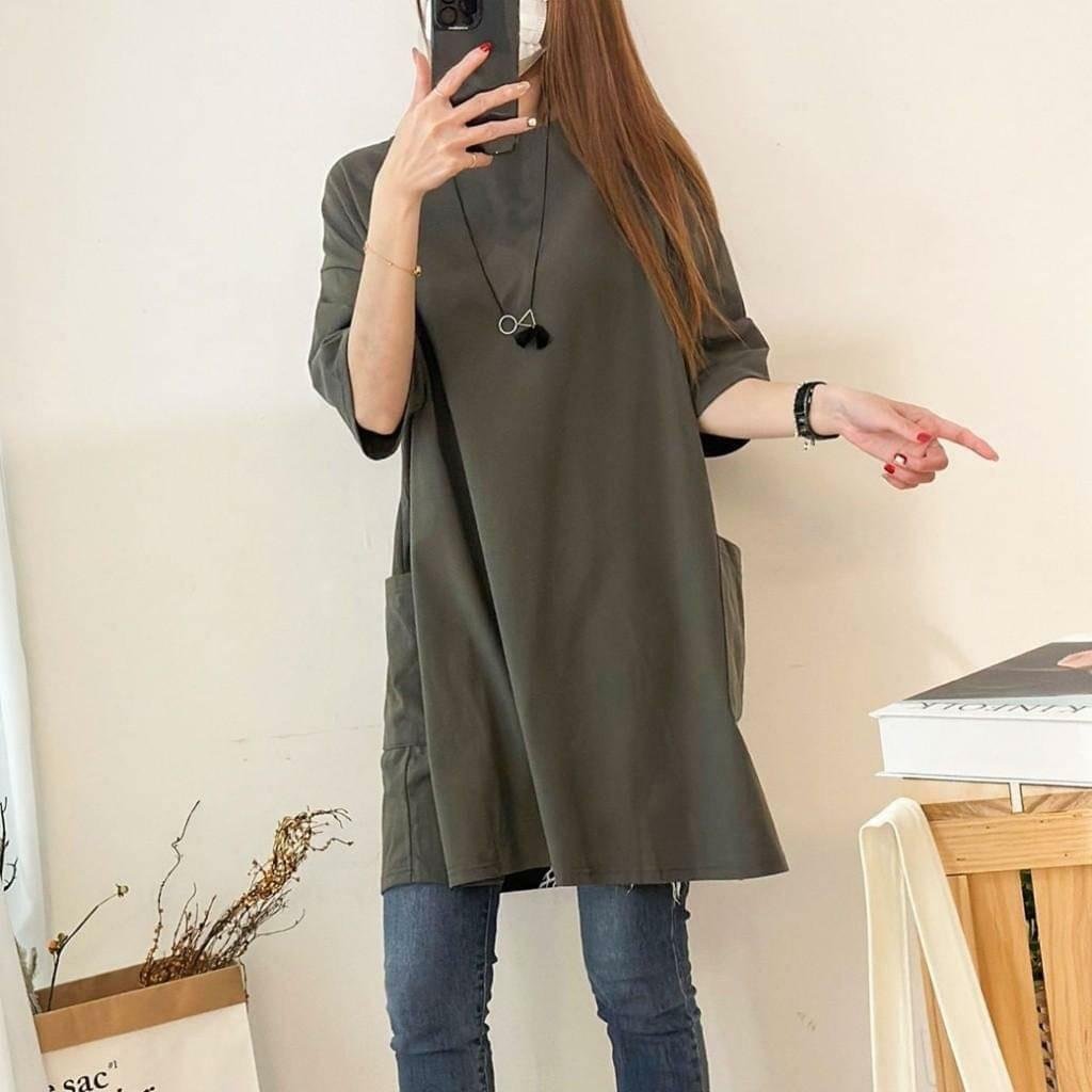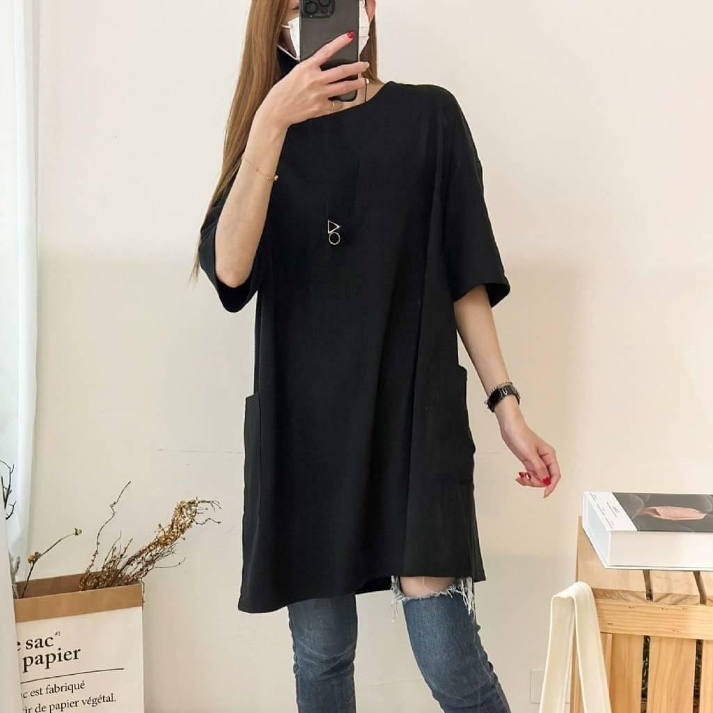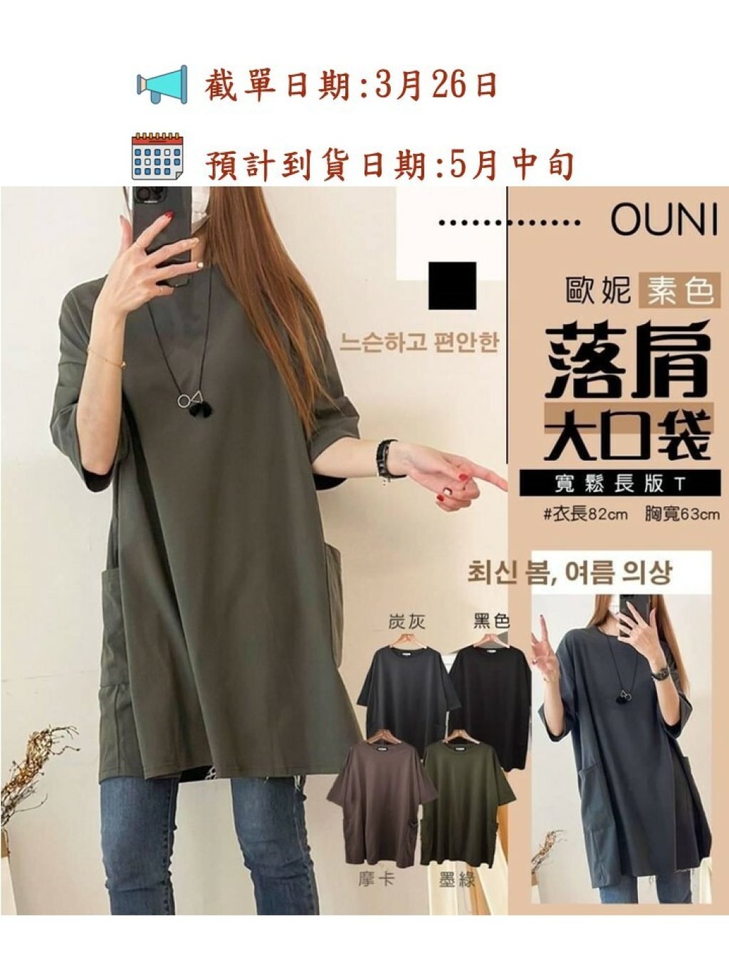 🟡台灣 歐妮 Ouni 素色落肩大口袋寬鬆長版T🟡