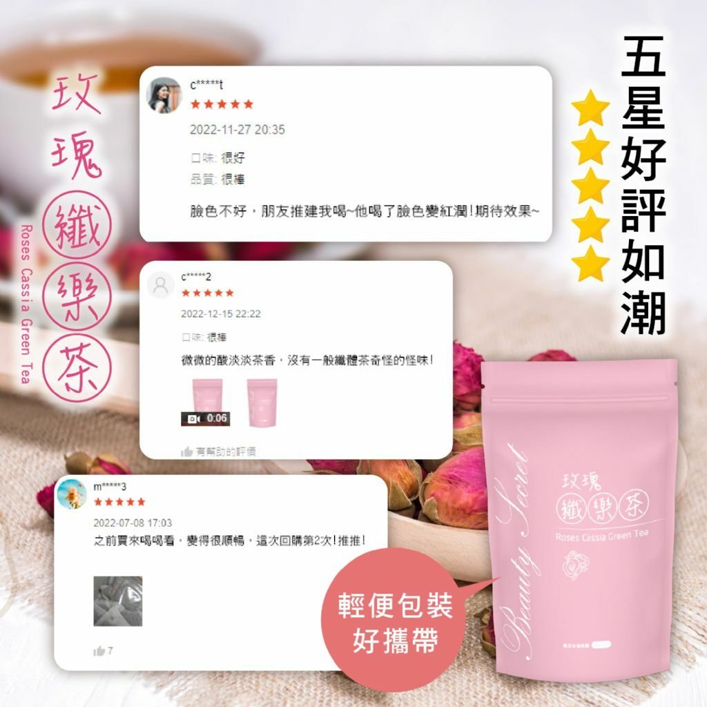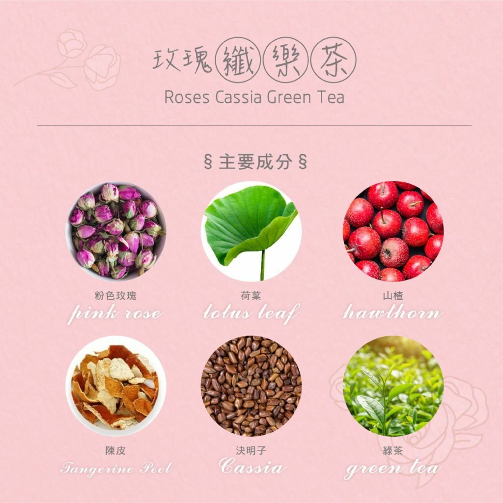 成分:粉紅玫瑰(伊朗)、荷葉、山楂、陳皮、決明子、綠茶