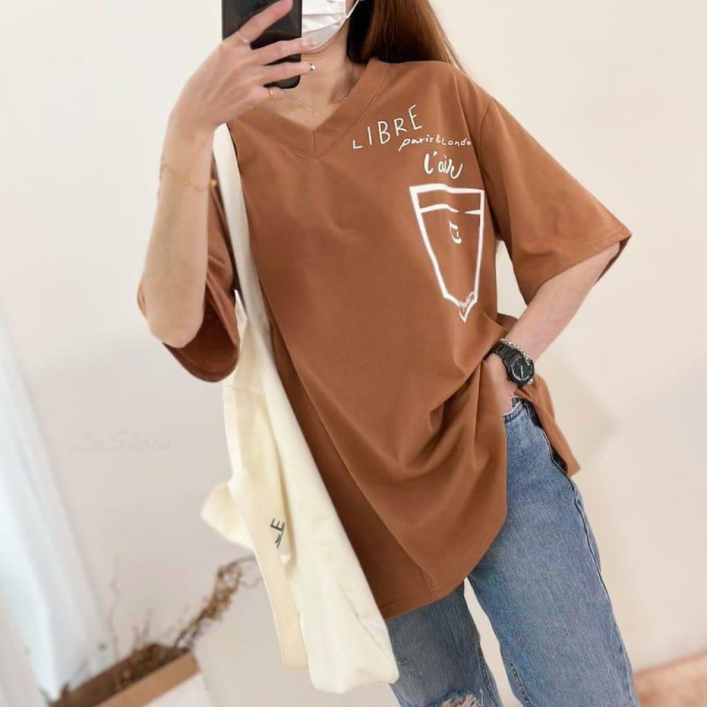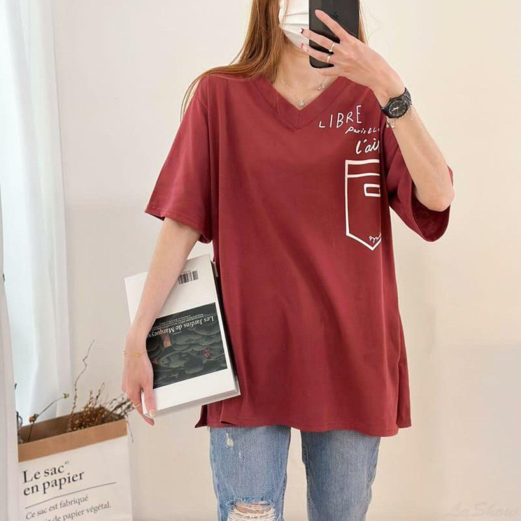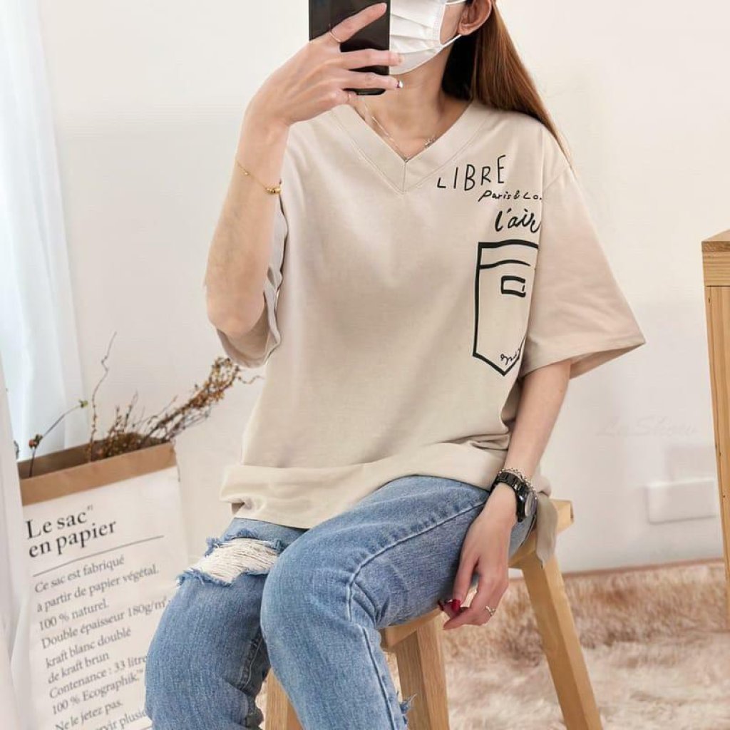 V領印花口袋側開衩短T