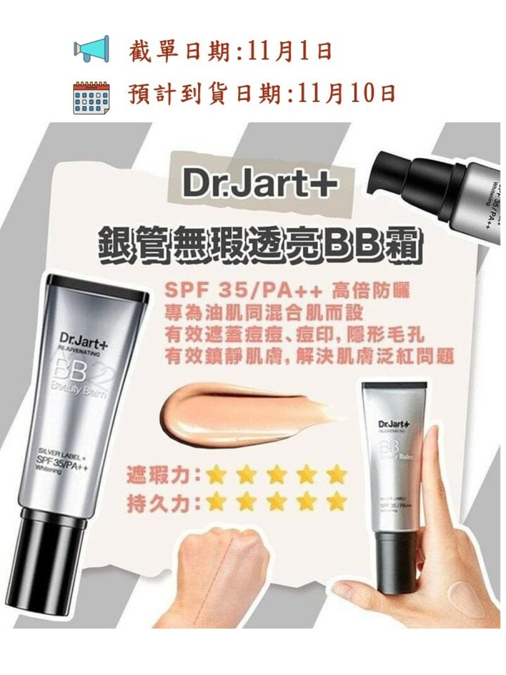 Dr.Jart +BB霜🇰🇷最大特點就系遮瑕強👍🏻持久性好⏰有鎮定皮膚既效果🌬非常適合問題肌既靚靚🧏🏻‍♀️皮膚狀態唔好既時候只要塗上這款BB霜🧴所有問題都可以遮蓋👩🏻‍🦰卸妝後💋皮膚甚至更加好🤩