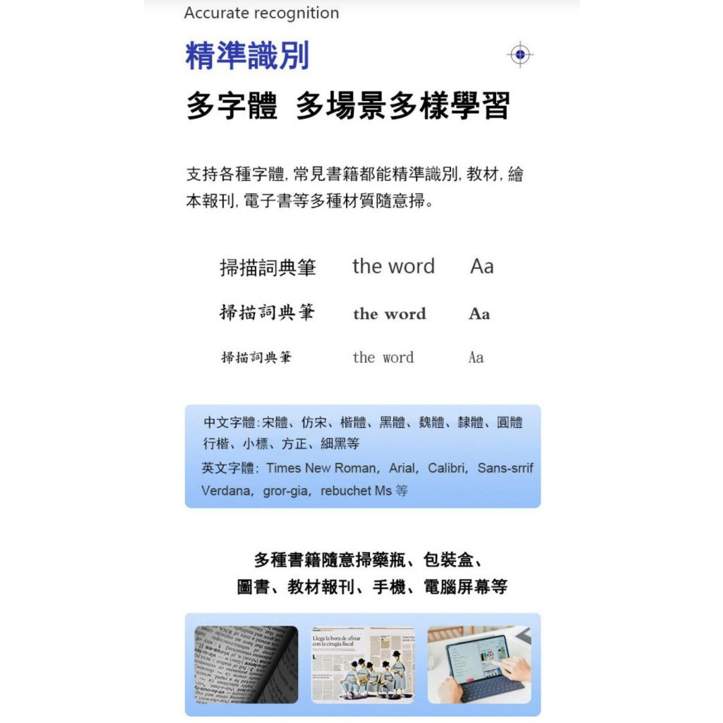 多元掃描方式:根據每個孩子使用習慣,設置左/右手掃描方式。橫掃/豎掃可以切換使用,橫向字體、縱向字體均可掃描