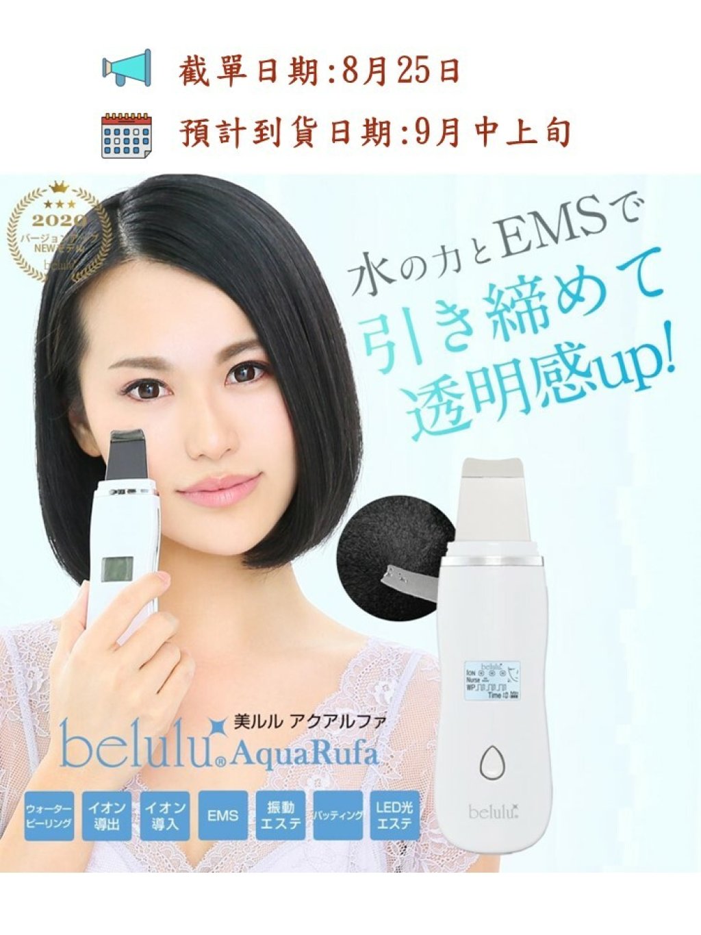 🟡belulu NEW AquaRufa 彩光去角質導入導出潔膚儀 (日本製造) - 白色🟡