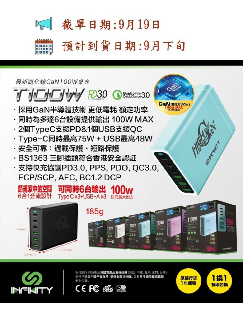 🟡Infinity 🇯🇵 氮化鎵T100W GaN3 100W Charging Hub *地上最平100W牛🟡