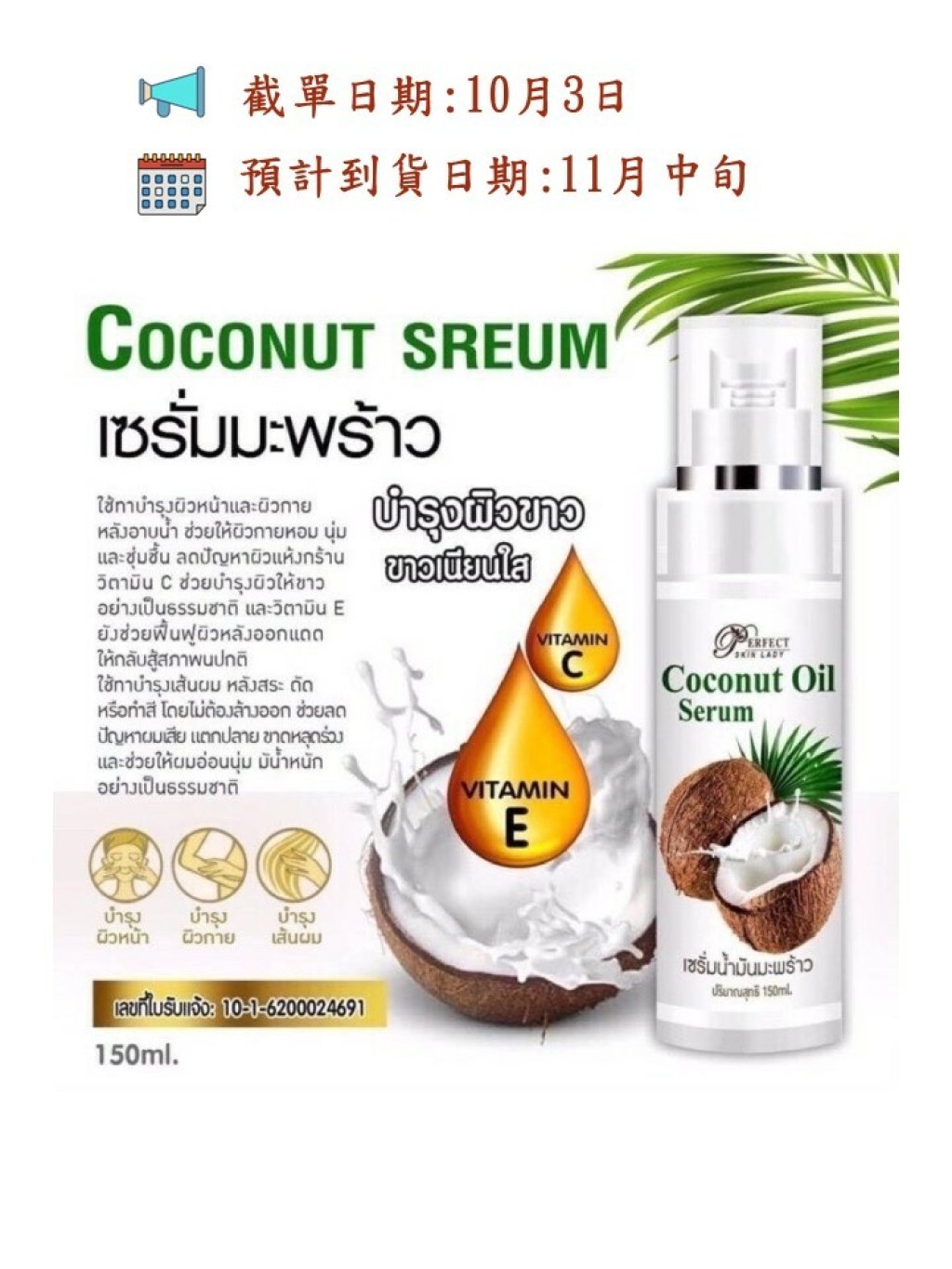 泰國直送🇹🇭 Perfect Skin 100% 純天然冷壓椰子油精華 150ml