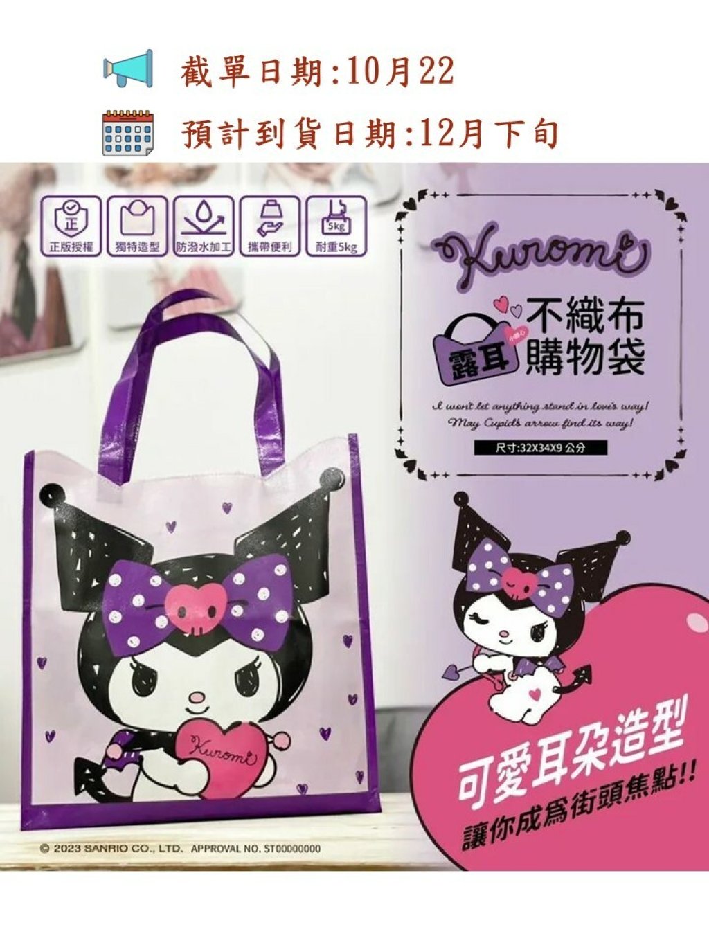 🟡Kuromi 酷洛米 露耳不織布購物袋 手提袋-小甜心款🟡