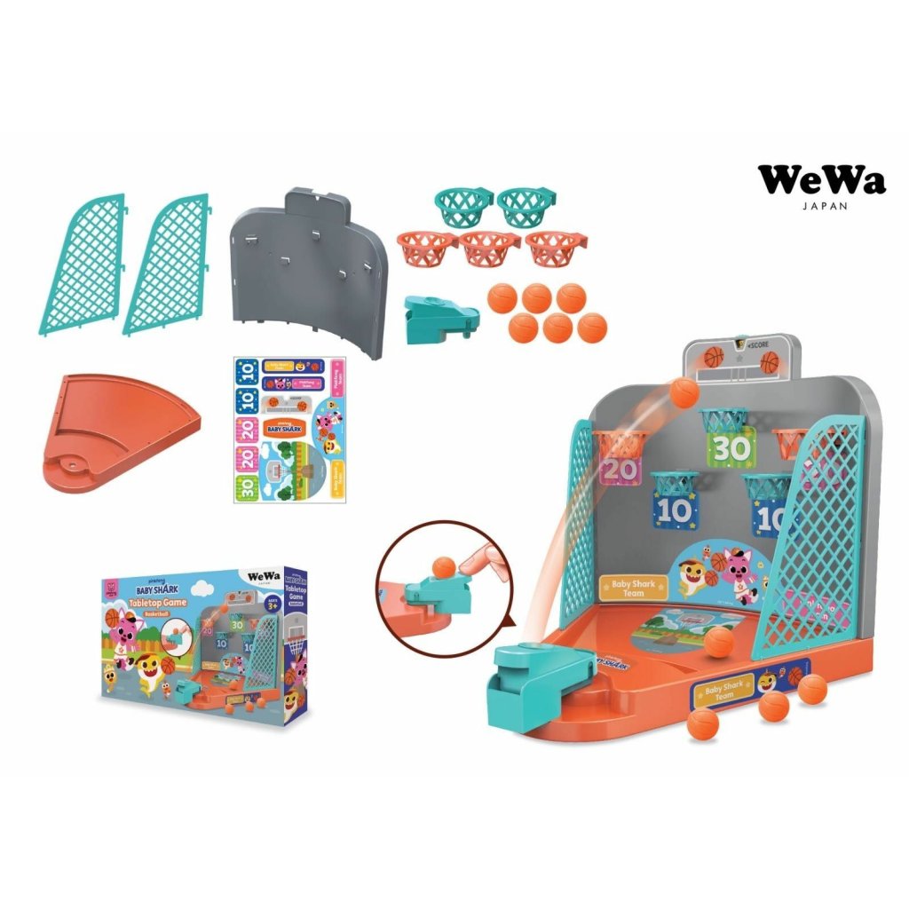 在一個明亮的遊戲室裡,Baby Shark和小朋友們圍繞著一個精心設計的籃球投籃套裝。這套裝包括一個可調節高度的籃球架、幾個彩色籃球和一個計分板。