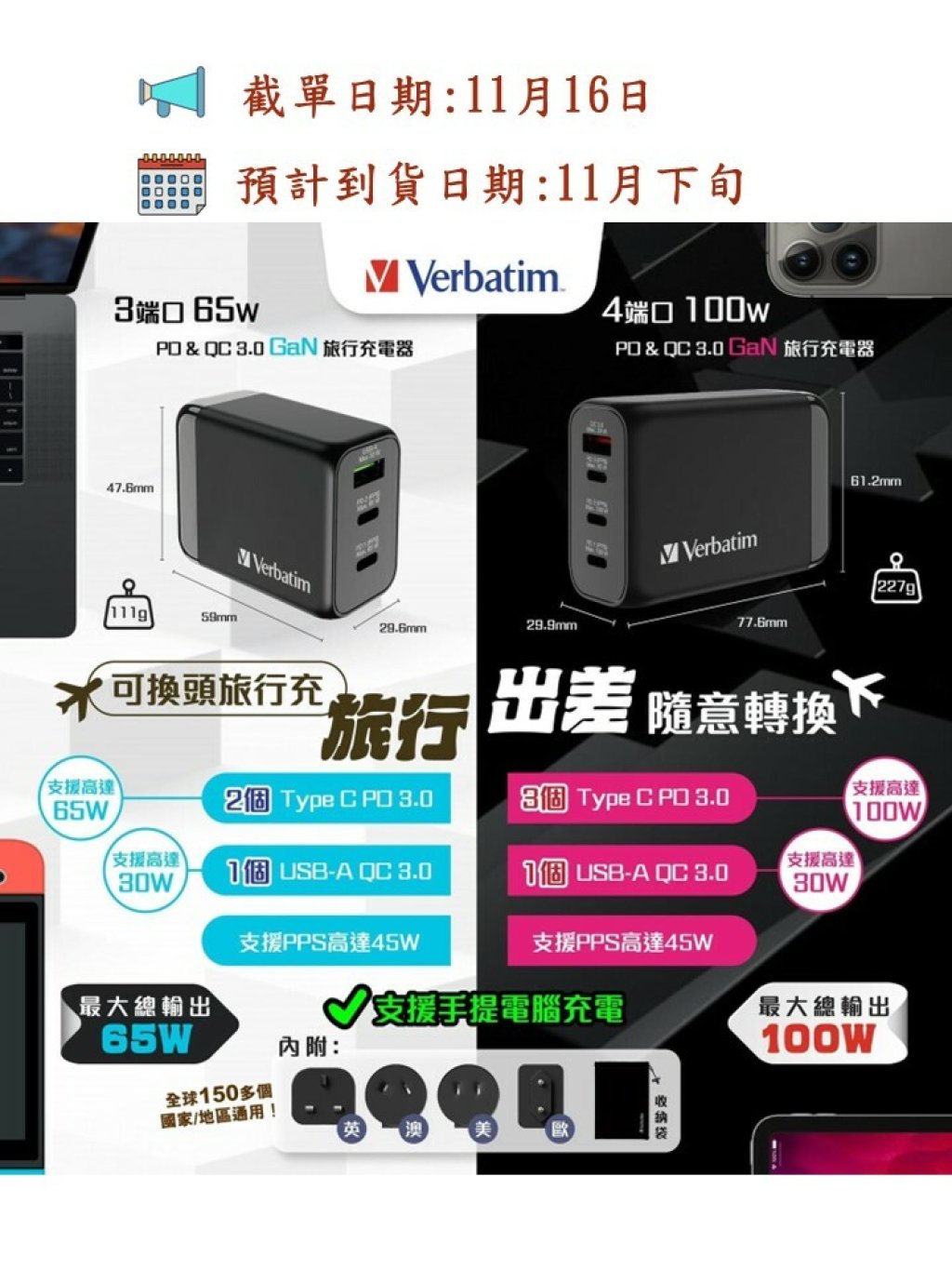 今次新出感 ✅3 連接埠 65W PD & QC 3.0 GaN 旅行充電器同 ✅4 連接埠 100W PD & QC 3.0 GaN 旅行充電器係以可更換式插頭設計,同樣配備 4️⃣ 款可感式國際插頭供替換,