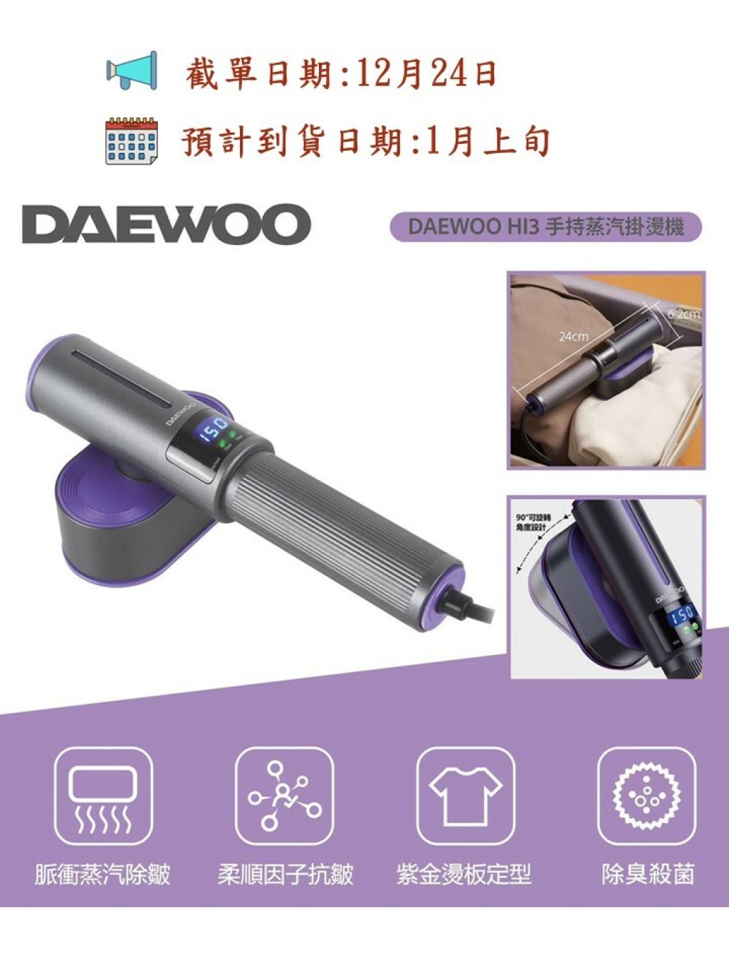 DAEWOO新款HI3手持智能蒸汽掛燙機, 輕感即熱,三重增壓強脈衝蒸汽,高速除皺,獨特紫金燙板設計,極速導熱,受熱平均。NTC 智能溫感可視化面板,