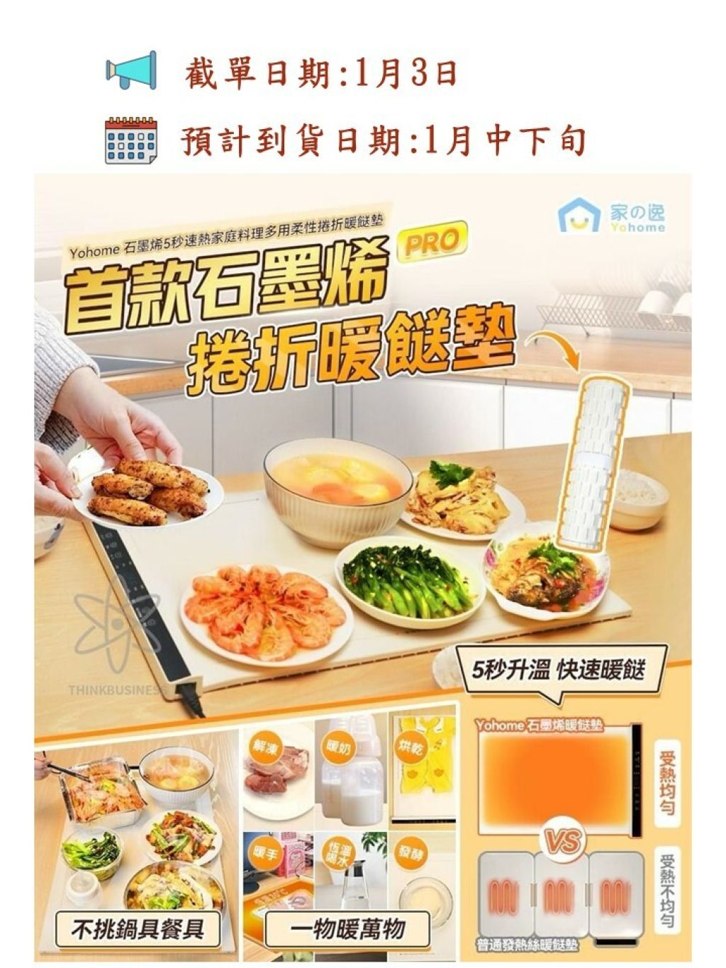 🟡日本Yohome石墨烯5秒速熱家庭料理多用柔性捲折暖餸墊🟡