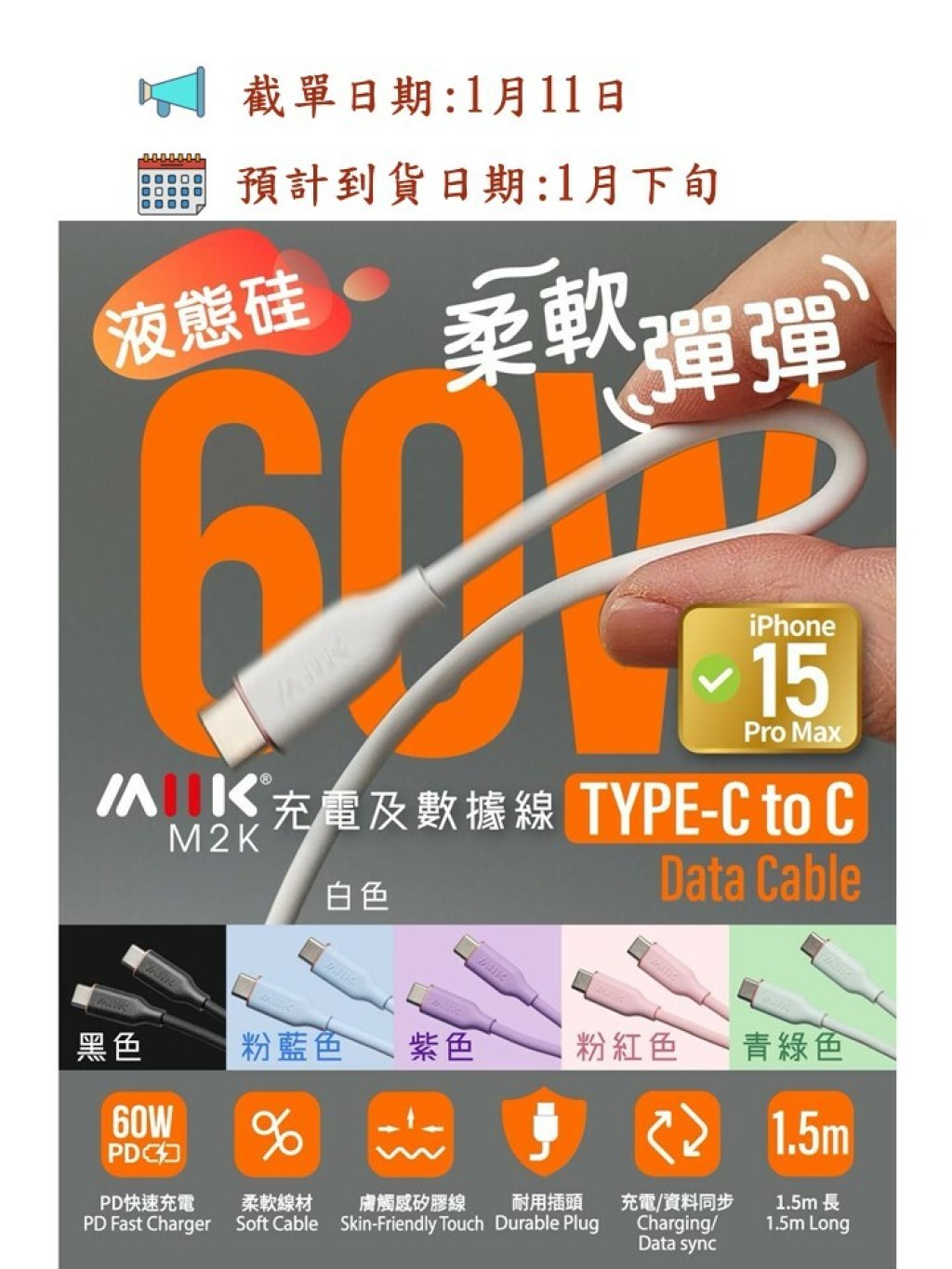 🟡M2K 60W 充電及數據線《Type-C to C 》🟡