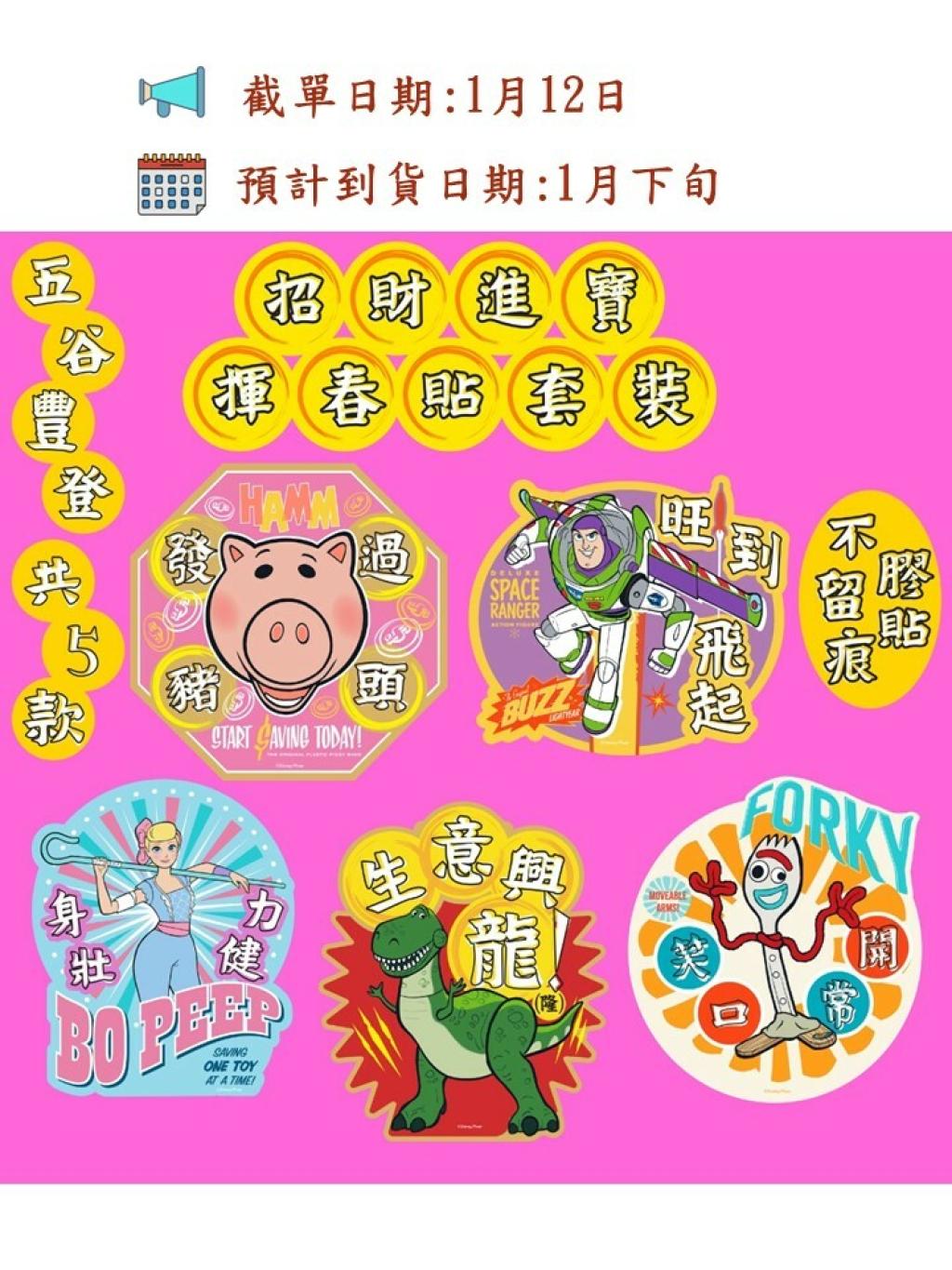 內含:抱抱龍、巴斯光年、火腿豬、牧羊女寶貝及小叉 揮春貼各一幅