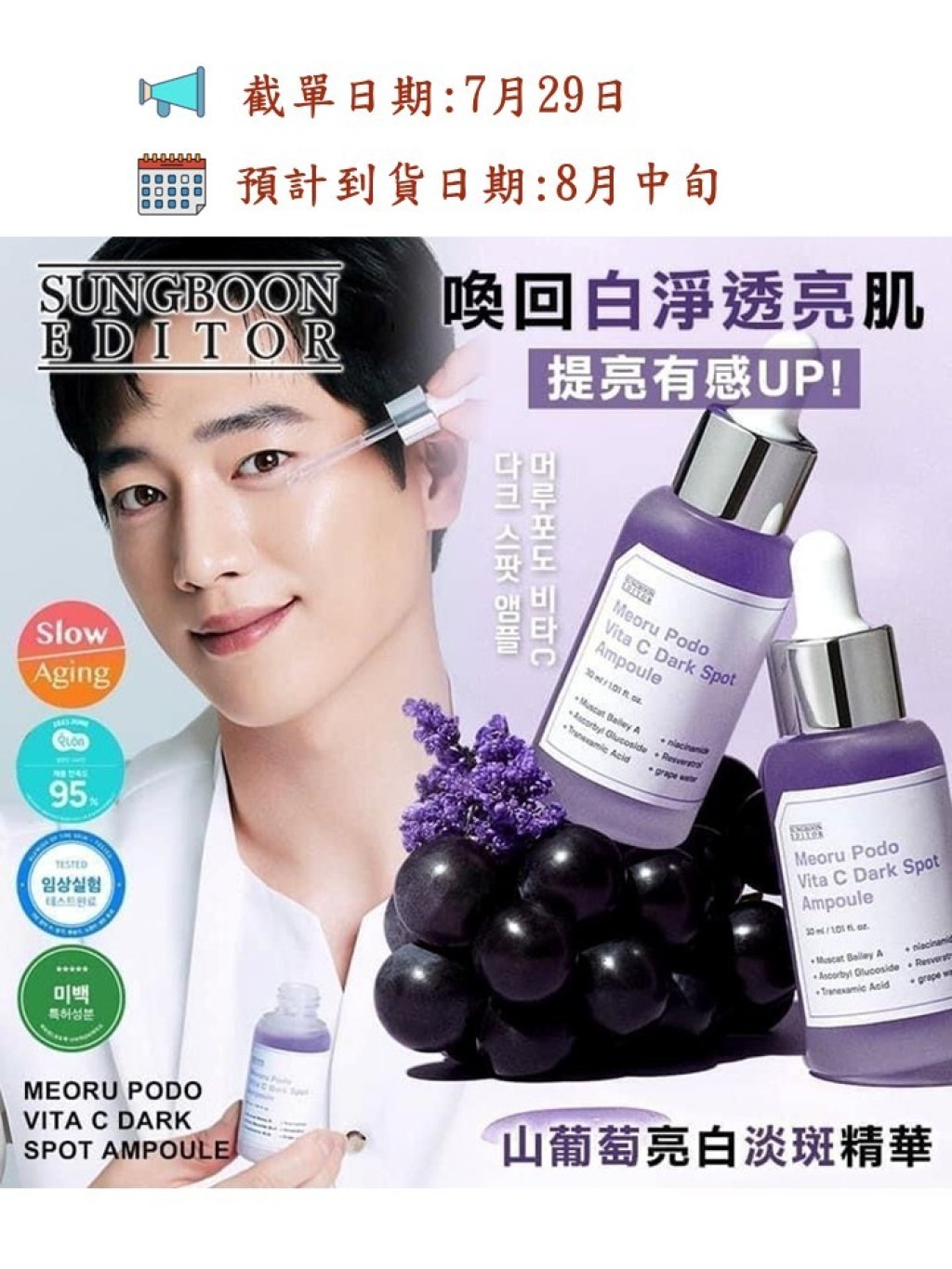 韓國🇰🇷人氣保養品牌 SUNGBOON EDITOR 推出的「山葡萄維他命C美白安瓶」,強力抗氧化功效,讓你的肌膚恢復彈潤光彩💎