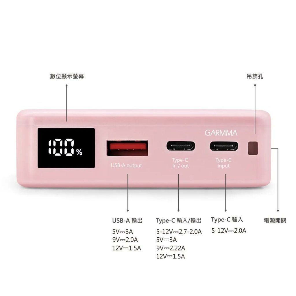 Type-C輸入&輸出: 5-12V/2.7-2.0A,5V/3A,9V/2.22A,12V/1.5A