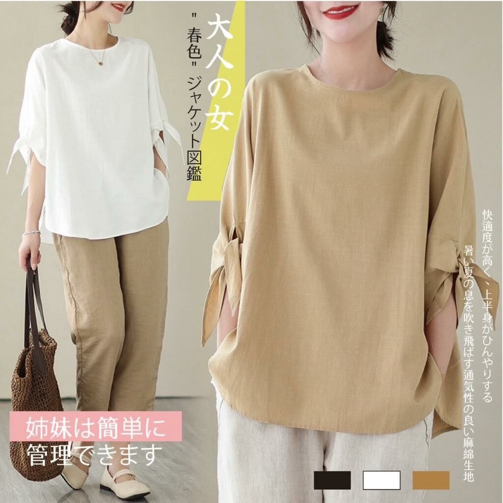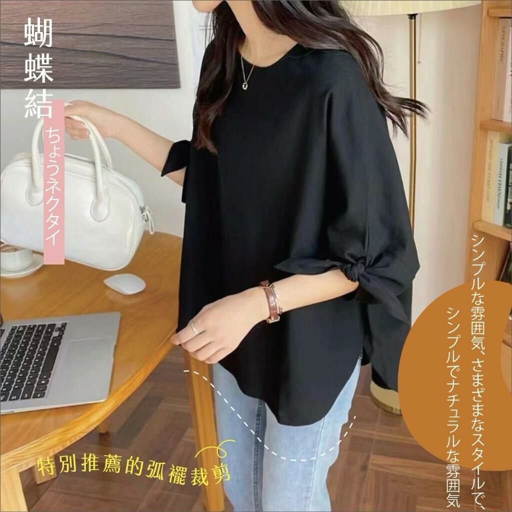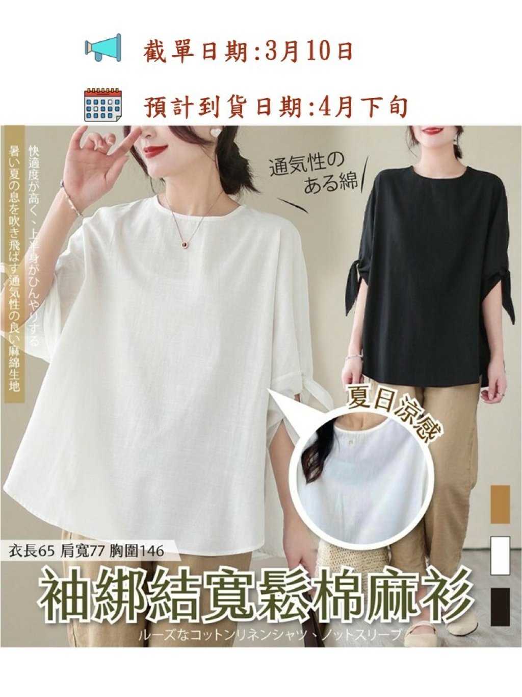 🟡【日系樂天女孩】袖綁結寬鬆棉麻純色衫🟡
