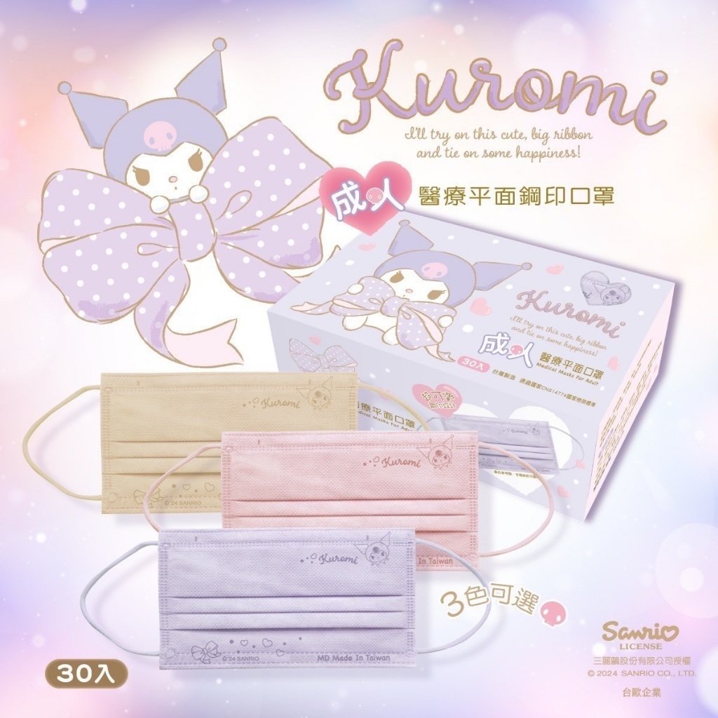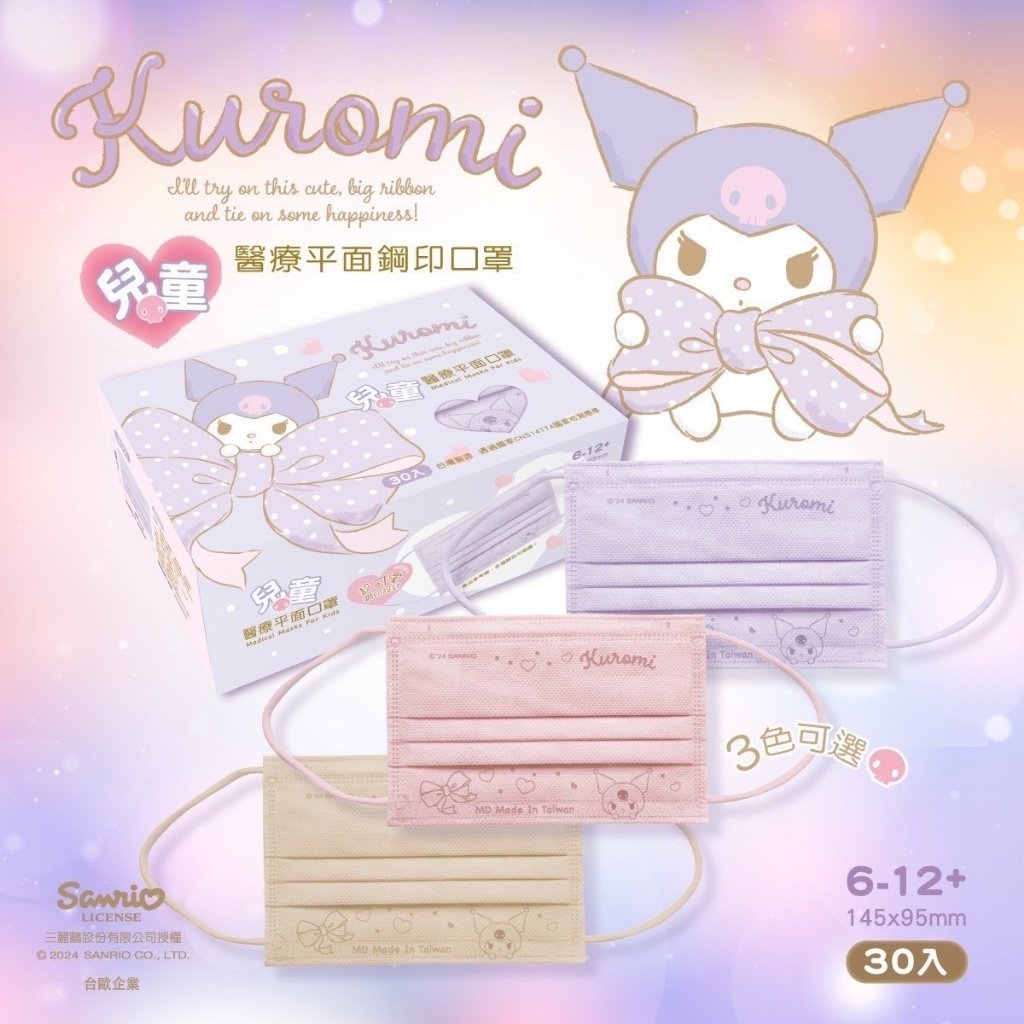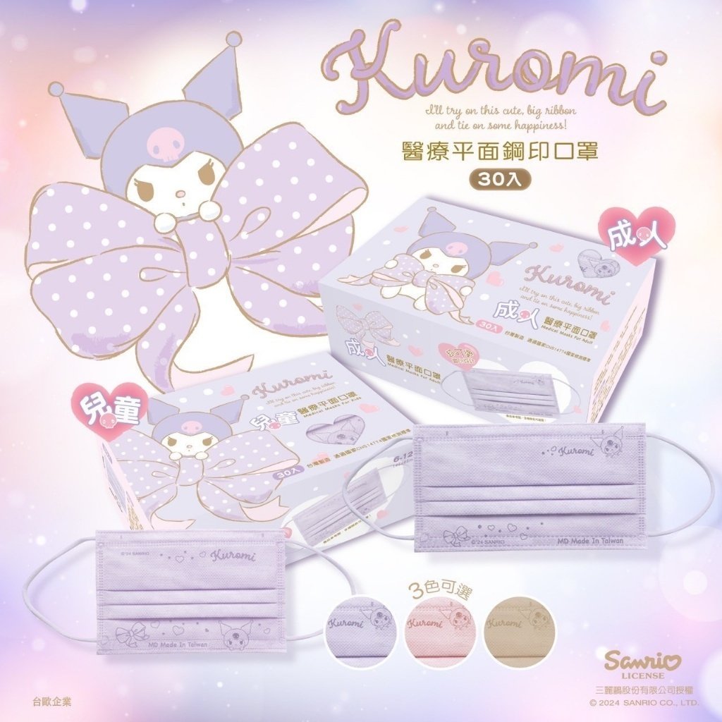 台灣 水舞 x 酷洛米 👨👩👧親子款平面口罩30入😷 (大人/兒童)(1組3盒)