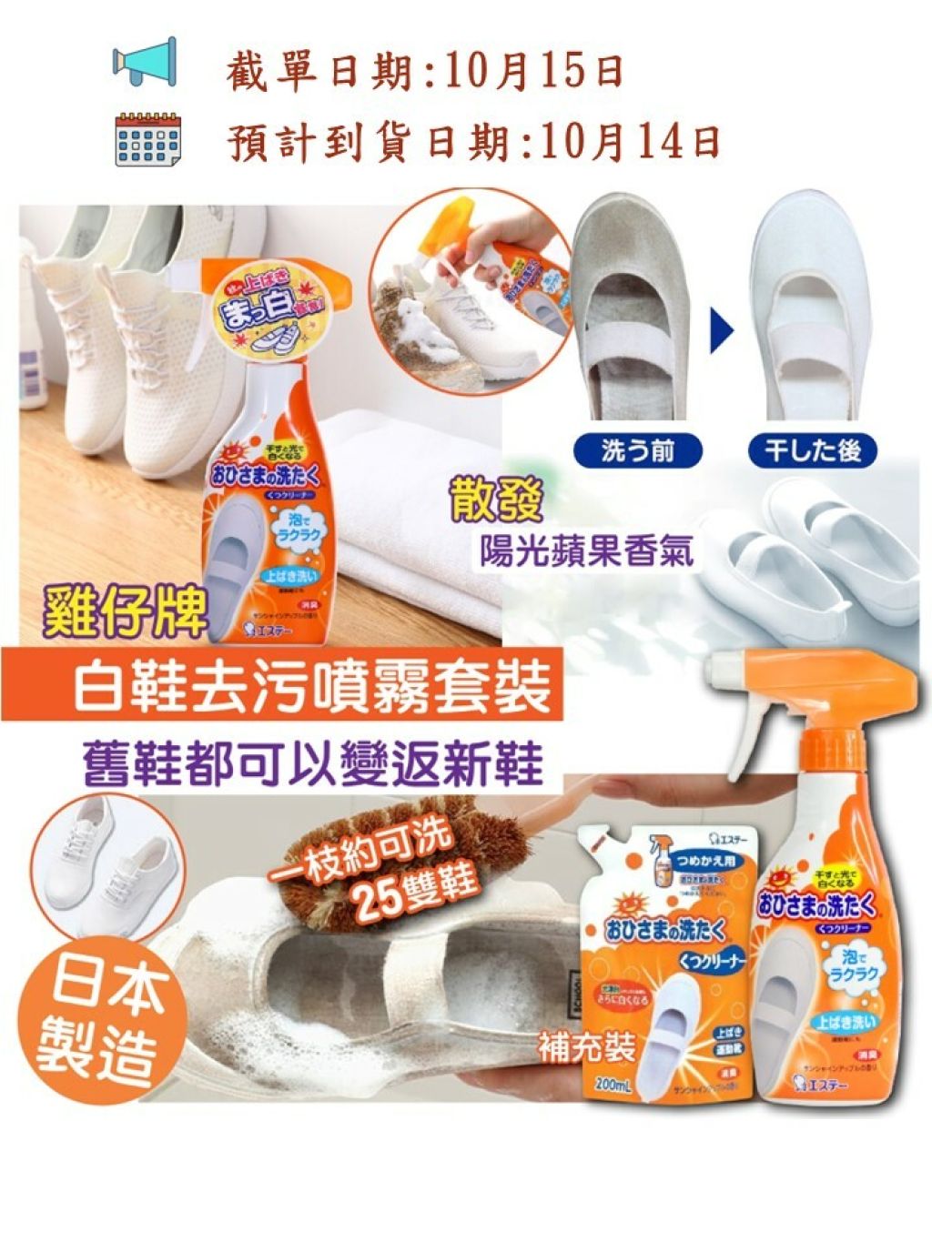 小朋友運動堂⛹🏼♂著既白鞋每次都係最易污糟又最難洗😞,最近係日本🇯🇵見到雞仔牌有一支運動小白鞋去污清潔噴霧,佢係利用光漂白成分⚪,只要洗完再曬一曬☀,就可以可以去除鞋子污漬👍🏻,分解鞋子的臭味和異味👍🏻,清潔噴霧係清新舒適既陽光蘋果香氣🍎, 一支大概可以洗30對鞋,最平$35都唔洗就有一支👍🏻,絕對係媽媽好幫手!👍🏻👍🏻👍🏻
