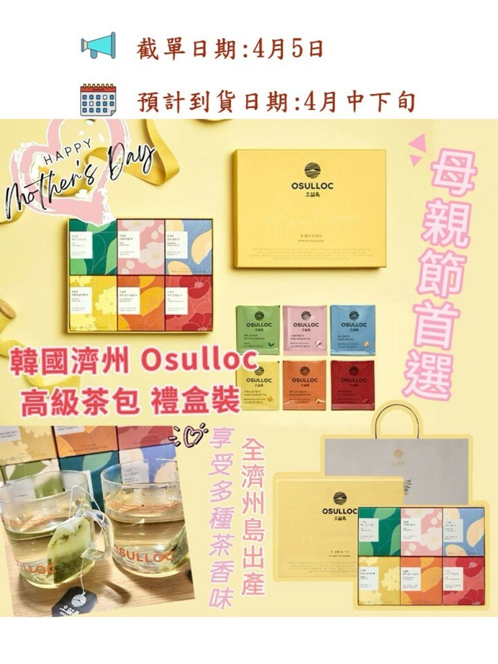 🟡母親節首選 - 韓國濟州 Osulloc高級茶包 禮盒連袋套裝🟡