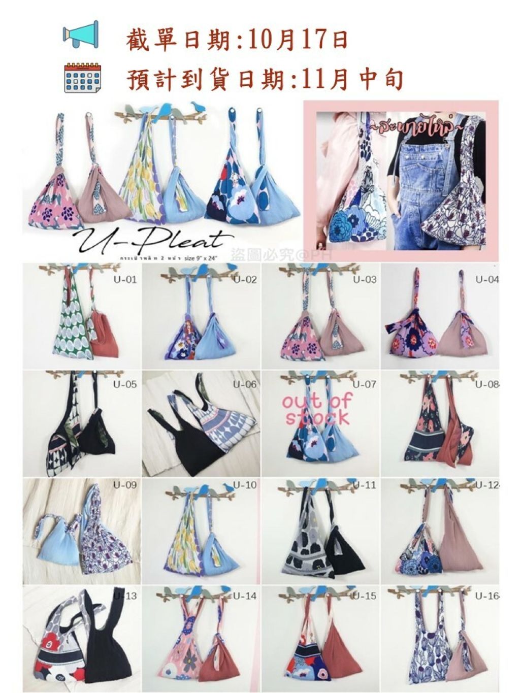 泰國自家品牌,店主強項係用花花布料🌸🌼💐花配合不同車工及袋型,設計出多個不同系列花花布袋👍😍😍加上使用密集百褶車工,令圖案不容易變型! 每款布袋輕巧耐用又易襯,價錢亦非常親民,確係換季首選💯💯