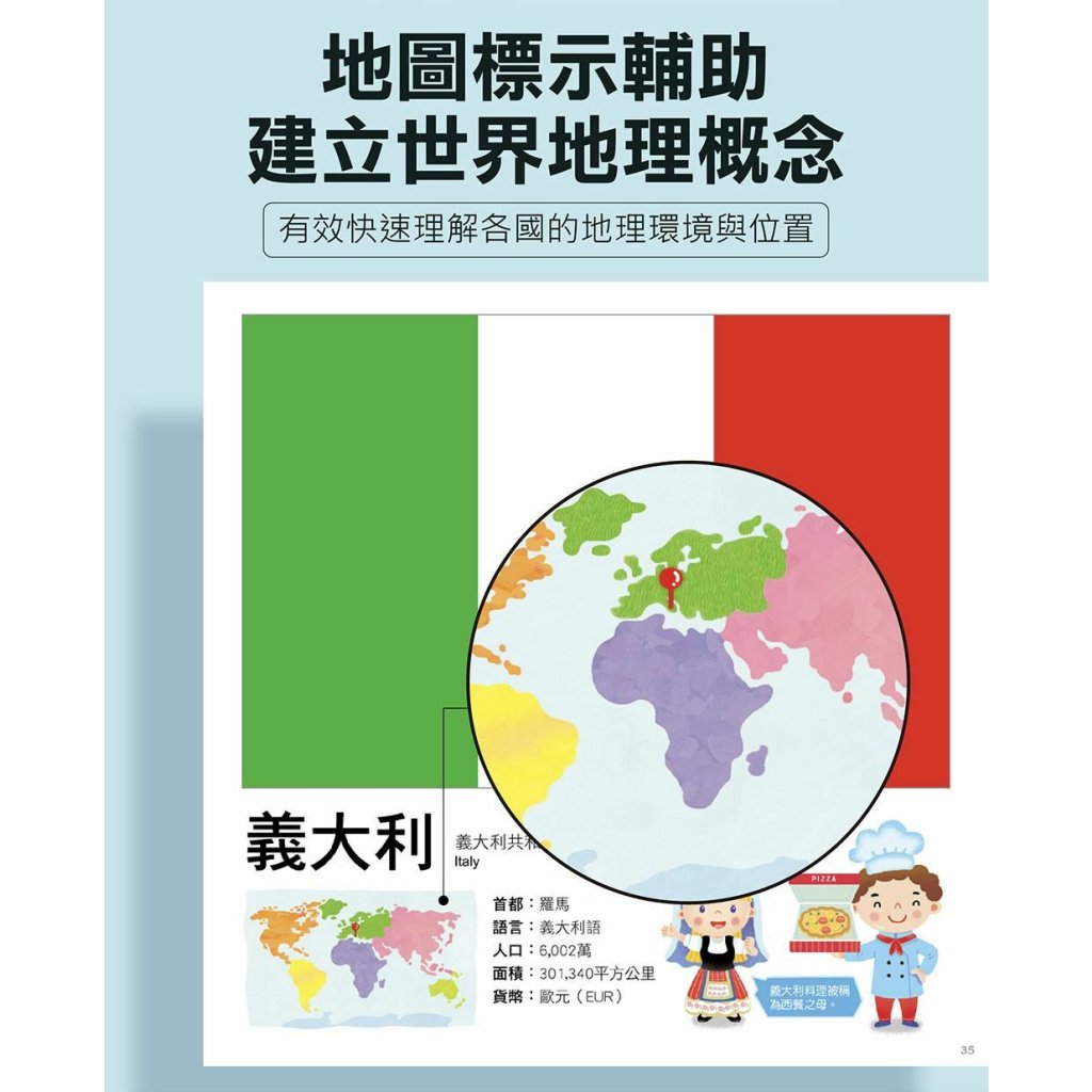 以地圖標示輔助,有效快速理解各國的地理環境與位置,拓展孩子的視野。