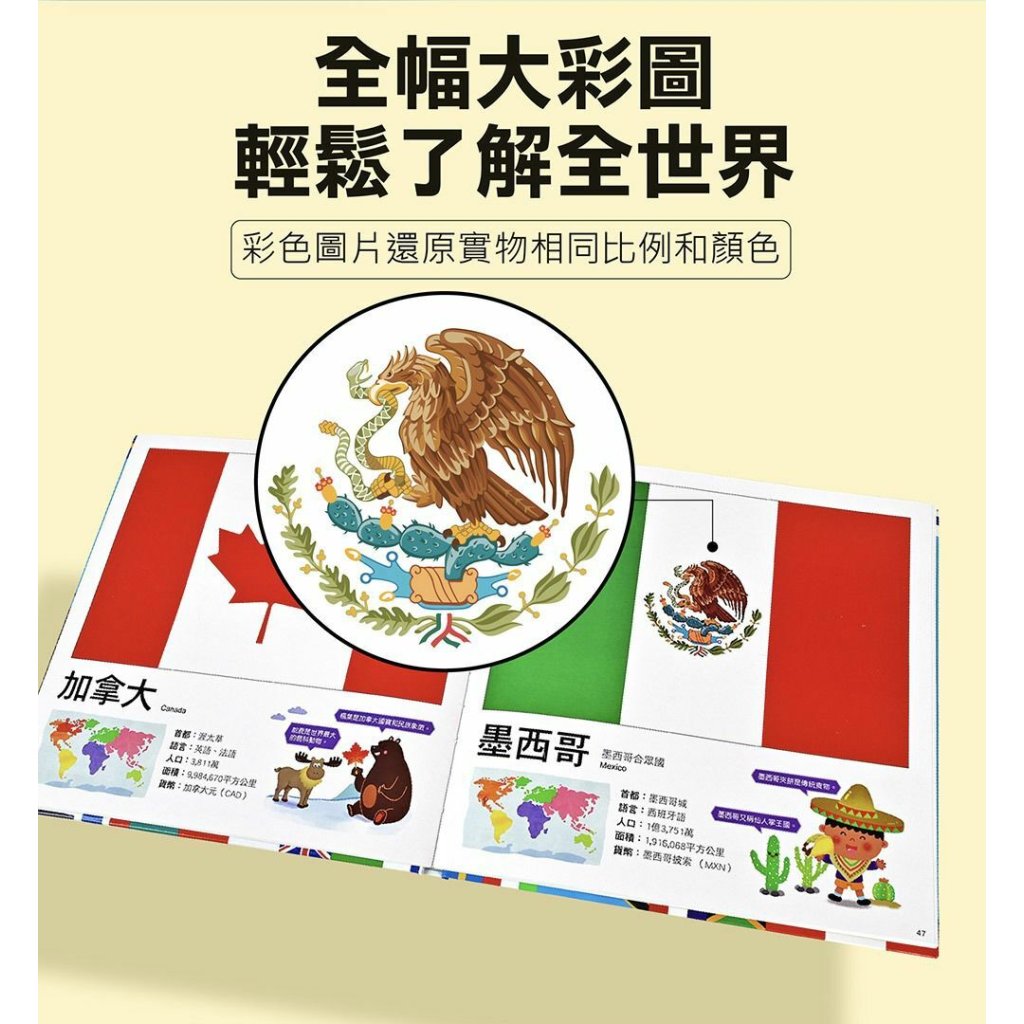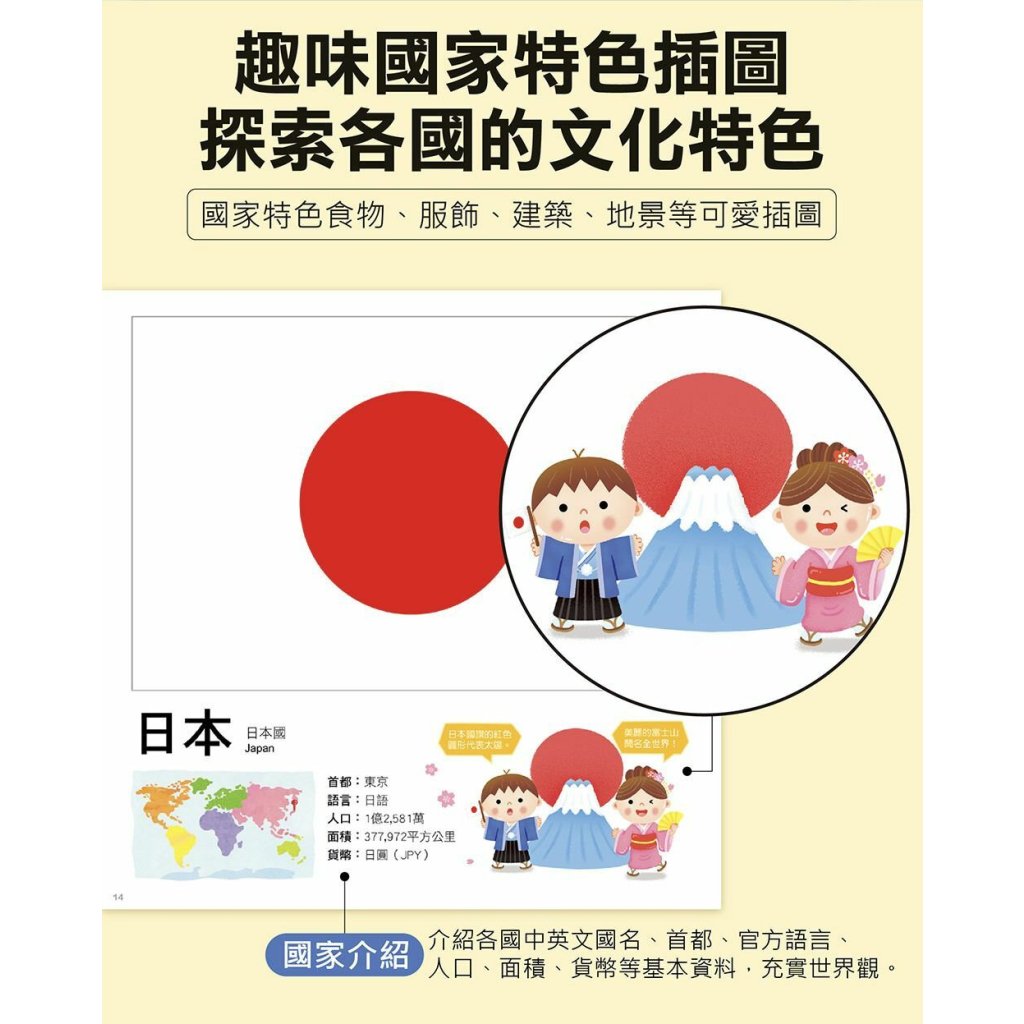 介紹各國國旗、中英文國名、首都、官方語言、人口、面積、貨幣等基本資料,充實世界觀。