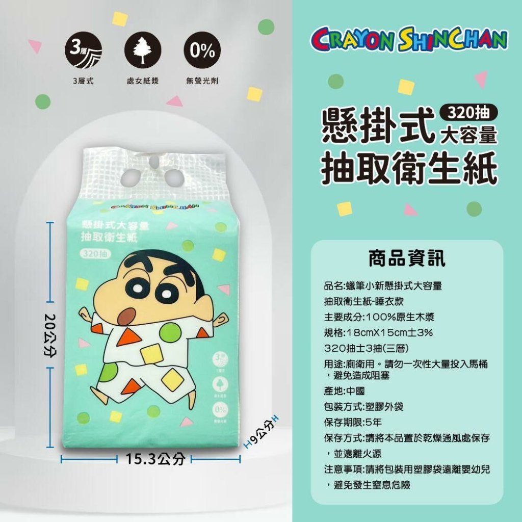 🟡台灣 蠟筆小新 懸掛式大容量抽取衛生紙-睡衣款320抽🟡