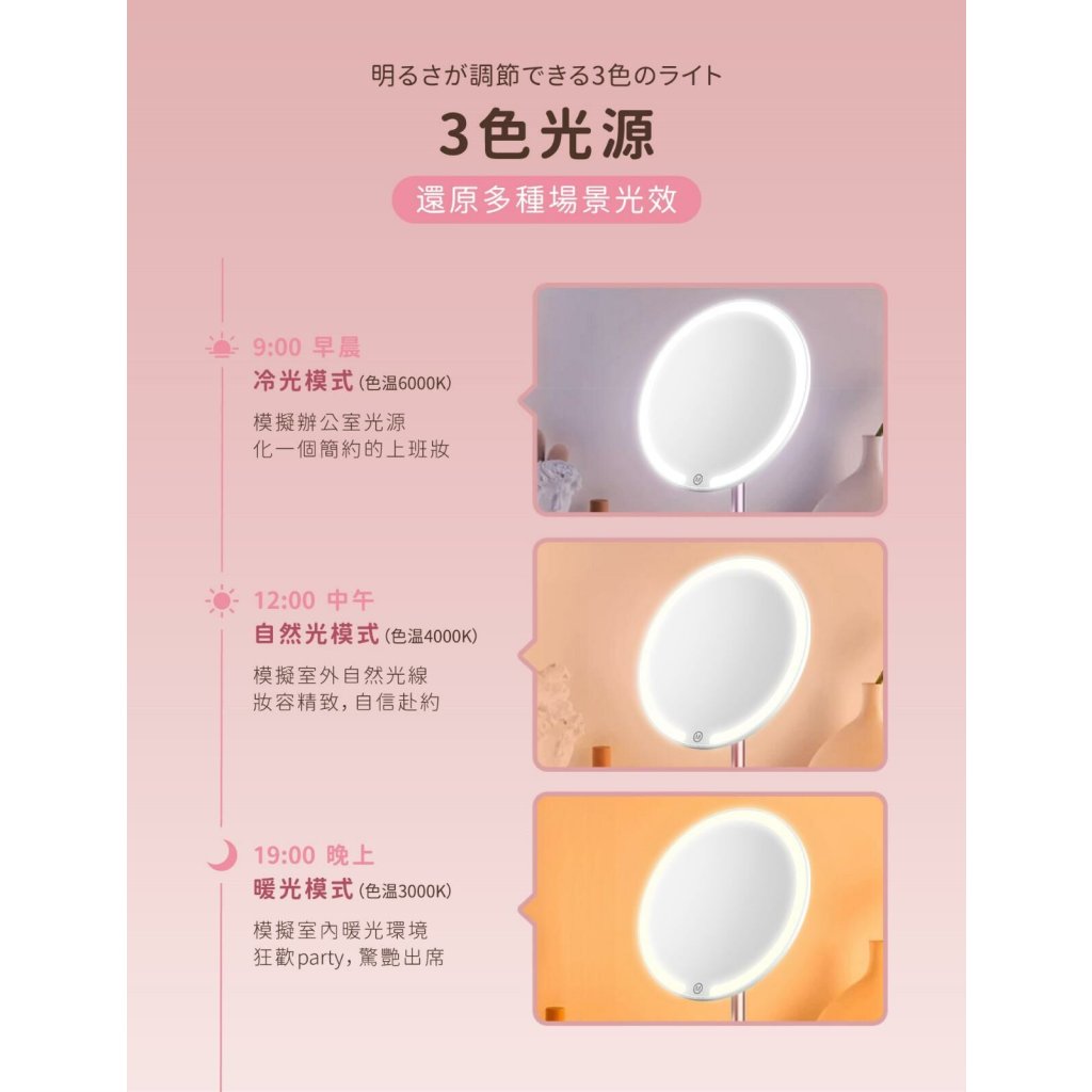 - 可調校三段LED色溫, 配合不同肌膚顏色