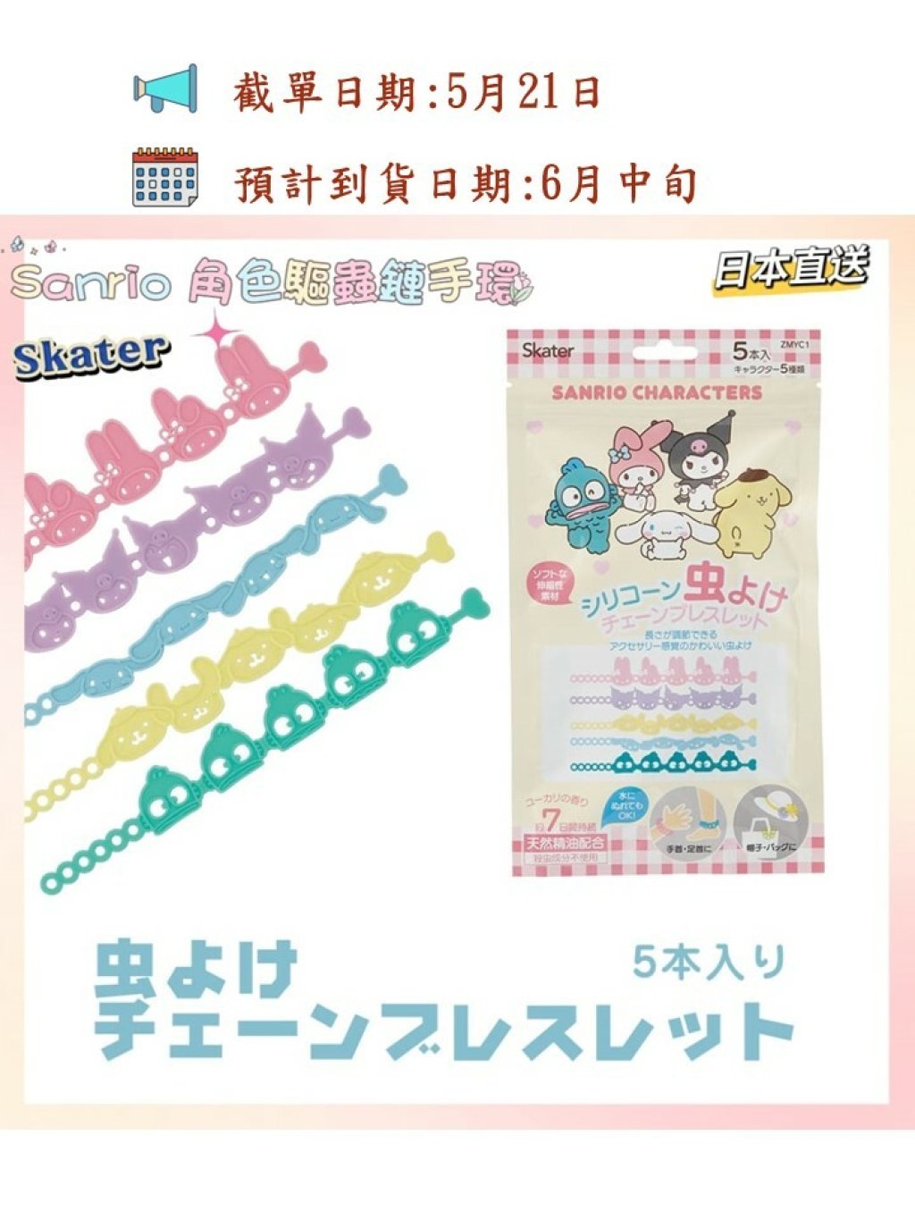 日本直送 Skater Sanrio 角色驅蟲鏈手環 5 枚入
