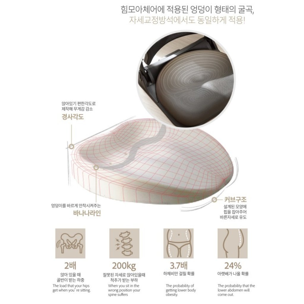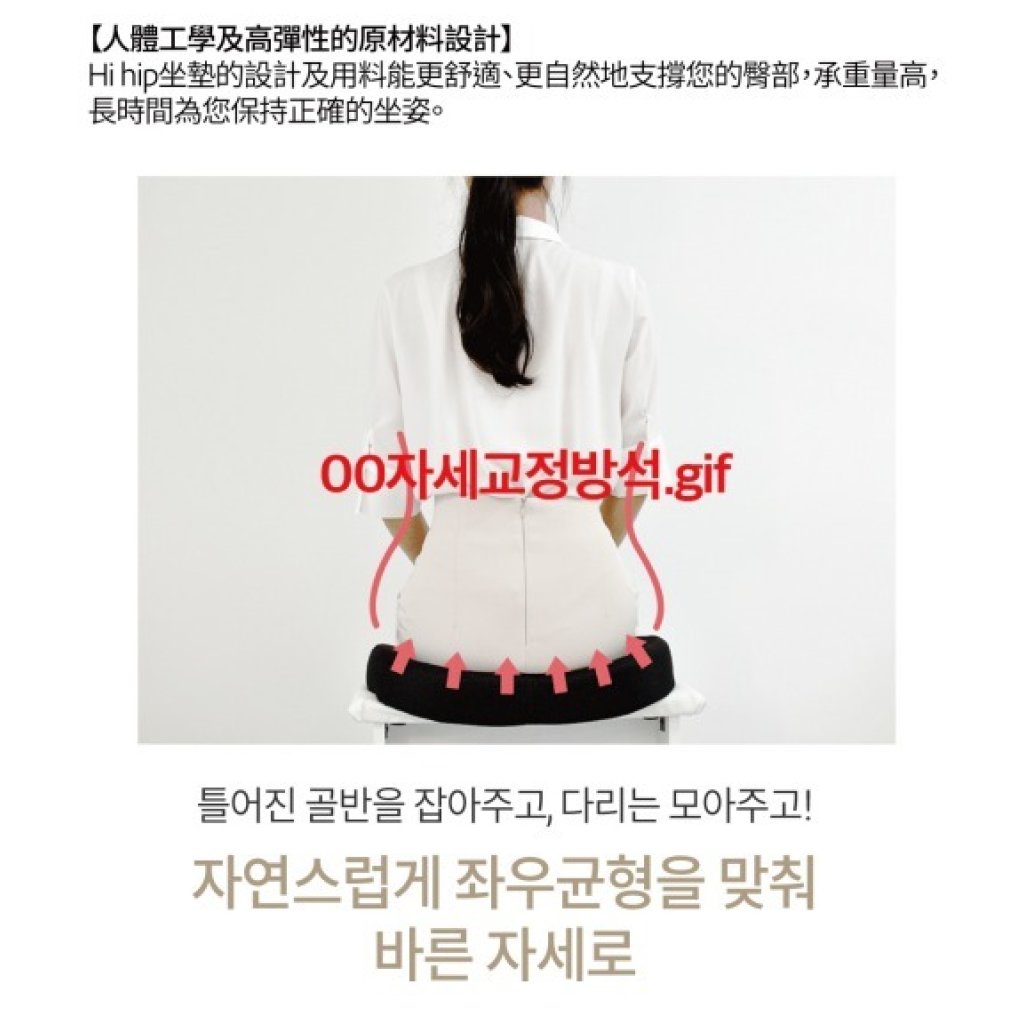 Hihip最新推出的矯正坐墊,採用了骨盆矯正專利技術,只需坐在此功能性坐墊上,便可以舒適地保持坐姿,通過人體工學及高彈性原材料設計,分散體壓底座支撐臀部和骨盆,