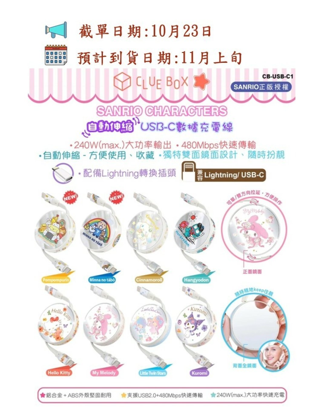 🟡Clue Box X Sanrio character 自動伸縮數據充電電線 (CB-USB-C1)🟡